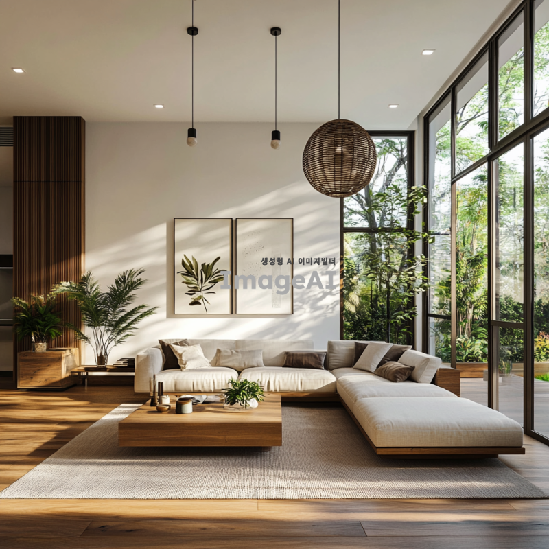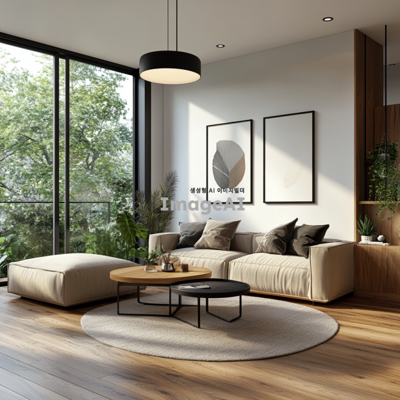 거실 내부, 현대적인 스타일, 넓은 창문으로 자연광이 들어오는 밝은 공간, 편안한 소파와 커피 테이블이 중앙에 배치되어 있으며, 벽에는 미니멀한 아트 작품들이 걸려 있음. 바닥은 따뜻한 색조의 나무 마루, 식물들이 곳곳에 배치되어 자연스러운 분위기 연출. 조명은 천장에 설치된 모던한 디자인의 펜던트 조명.