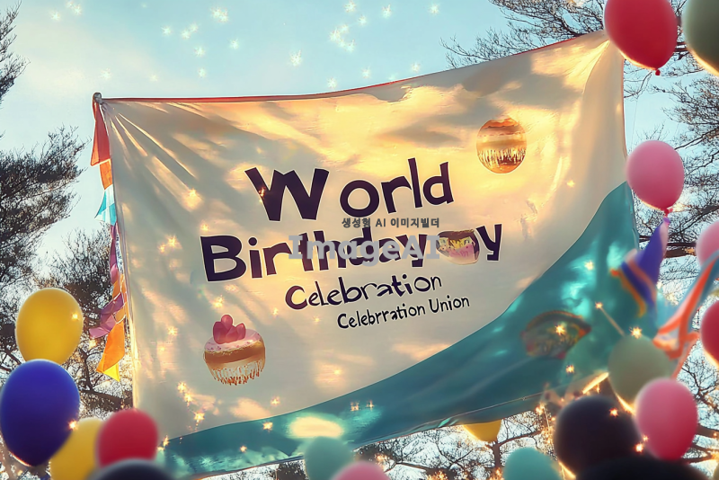 세계생일축하연합이라는 문구가 중앙에 크게 쓰여 있는 네모난 깃발, 바람에 펄럭이는 모습, 밝고 생동감 있는 색상, 깃발의 배경은 축제 분위기를 연상시키는 디자인, 깃발의 가장자리에 다양한 색상의 풍선과 리본 장식, 깃발의 질감은 부드럽고 자연스럽게 표현, 햇빛이 깃발에 비쳐 반짝이는 효과.