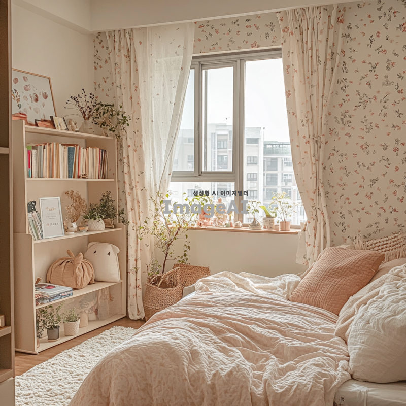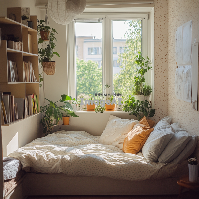 따뜻하고 아늑한 분위기의 20살 여성이 처음 자취하는 방, 벽에는 부드러운 파스텔 톤의 벽지가 있고, 창문으로 들어오는 자연광이 방을 환하게 비추는 모습, 방 한쪽에는 아기자기한 장식품이 있는 책장과 작은 화분들이 놓여 있으며, 편안한 소파와 쿠션이 있는 작은 거실 공간, 침대에는 푹신한 이불과 귀여운 베개가 놓여 있는 따뜻한 느낌의 침실, 바닥에는 부드러운 러그가 깔려 있어 포근한 느낌을 주는 방, 전체적으로 깔끔하고 정돈된 인테리어, 창문 밖으로는 맑은 하늘과 푸른 나무들이 보이는 장면.