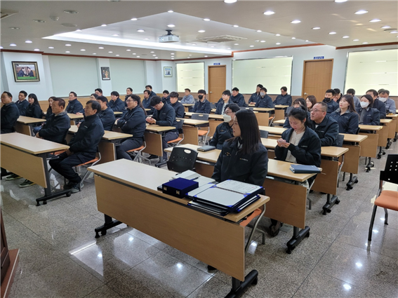 현대적인 사내 강의실에서 유니폼을 입고 앉아 있는 직원들, 집중해서 강의를 듣고 있는 모습, 강의실은 밝고 깔끔하며, 책상과 의자가 잘 정돈되어 있음, 직원들은 다양한 연령대와 성별로 구성되어 있으며, 각자의 노트에 메모를 하고 있는 모습, 강의실 앞에는 프레젠테이션 화면이 보이며, 교육 자료가 화면에 표시되어 있음