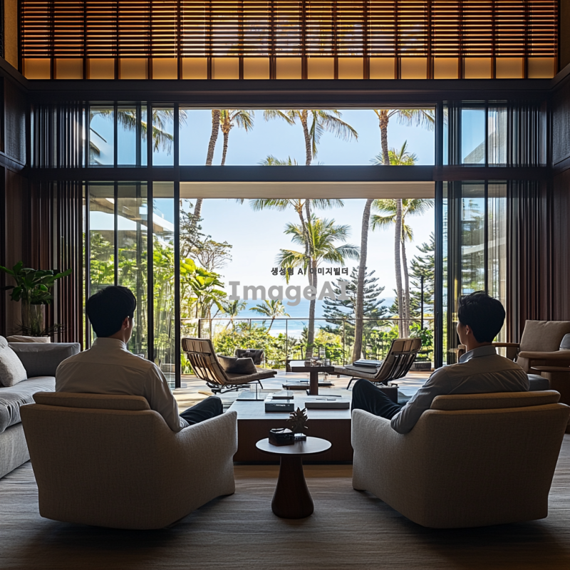 하와이대저택의 고급스러운 거실, 두 명의 한국인 남성이 1인용 소파에 서로 마주 보고 앉아 진지하게 대화를 나누는 장면, 방 안은 세련된 인테리어와 자연 채광이 어우러져 있으며, 편안하고 전문적인 분위기.
