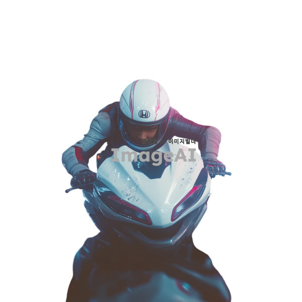 사이버펑크 도시에 있는 한국인 남성이 혼다 오토바이를 타고 있는 장면. 배경은 네온 불빛이 가득한 도시의 밤거리로, 미래적인 건물들과 광고판이 보임. 남성은 헬멧을 쓰고 있으며, 오토바이는 현대적이고 세련된 디자인으로 묘사됨. 아키라 스타일의 강렬한 색감과 역동적인 구도가 강조된 이미지.