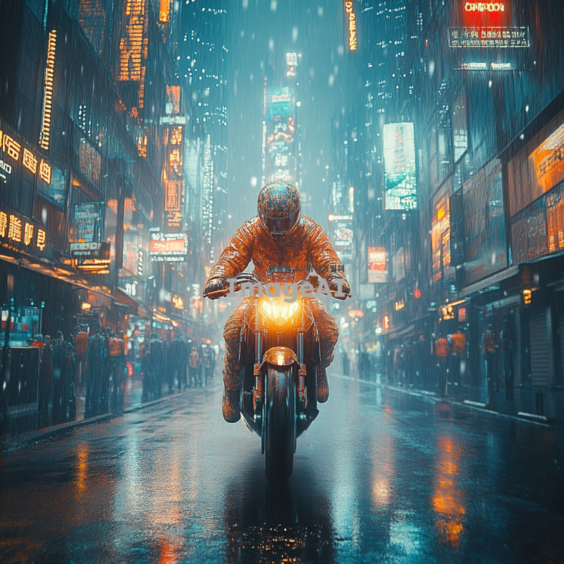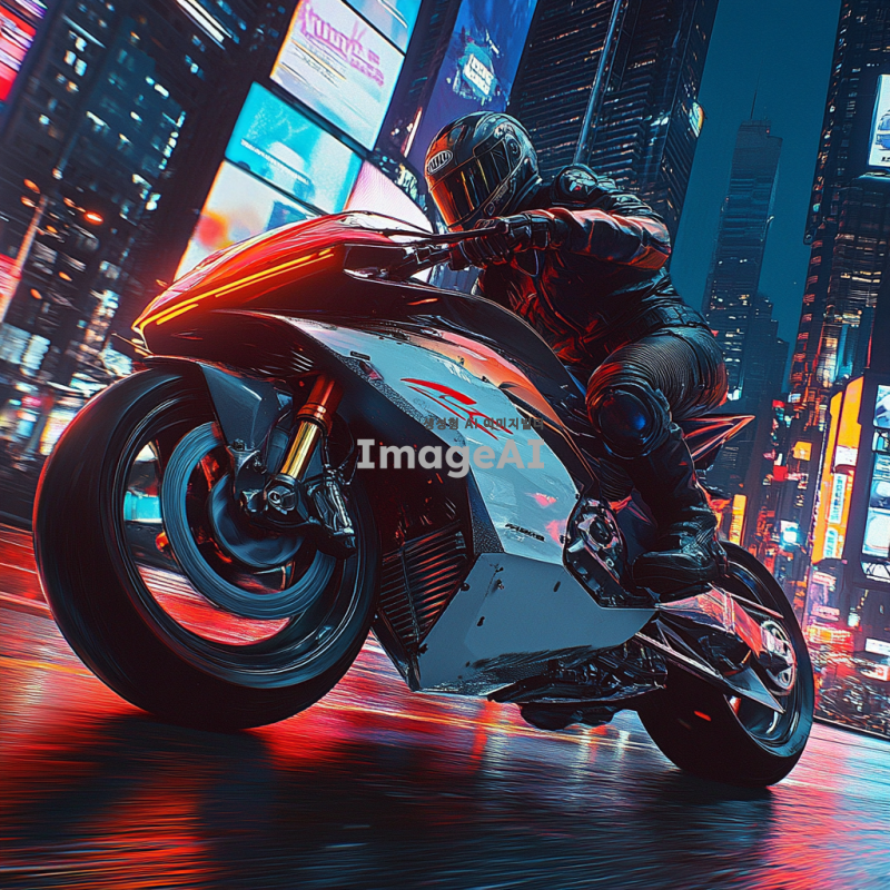 사이버펑크 도시 배경, 네온 불빛이 반짝이는 거리, 혼다 오토바이를 타고 있는 남성, 빠르게 드리프트하는 역동적인 모습, 아키라 명장면의 미래적인 분위기, 남성은 헬멧을 착용하고 있으며, 바람에 날리는 옷자락, 오토바이의 디테일한 기계적 요소, 도시의 고층 빌딩과 광고판, 어두운 밤 하늘에 반사되는 불빛, 원근감 있는 요소