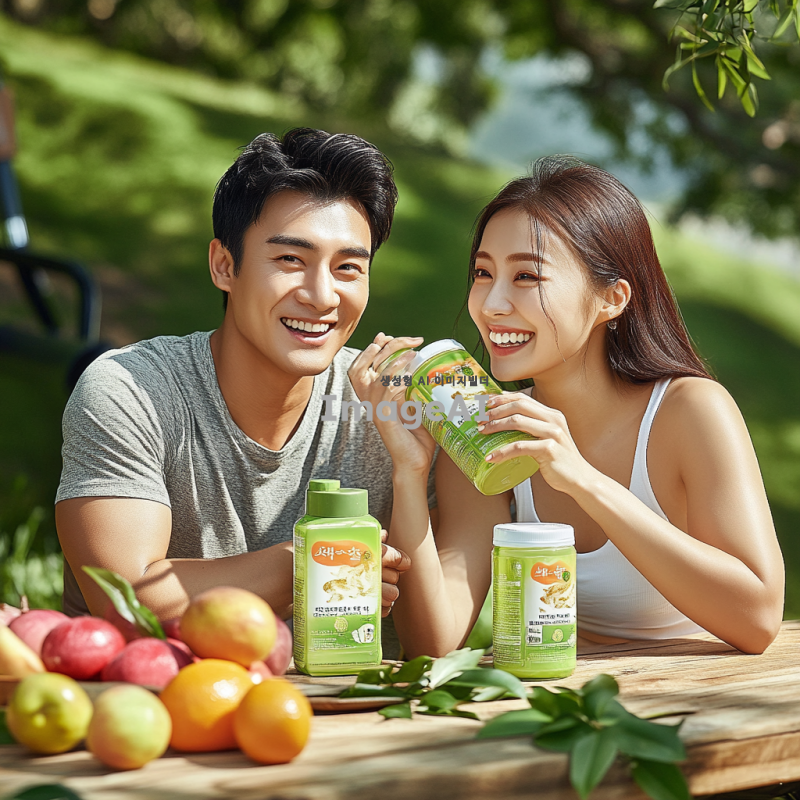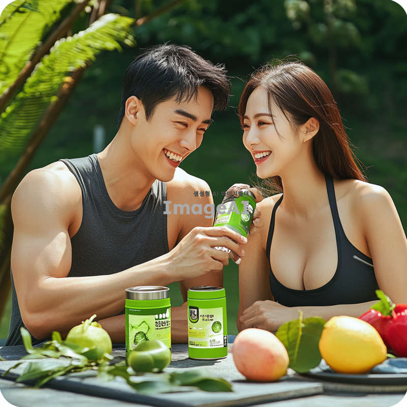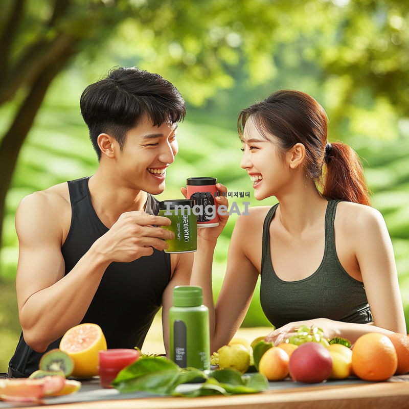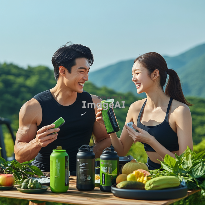 밝고 활기찬 분위기의 발포 프로틴 이미지, 한국인 남성과 여성이 운동 후 발포 프로틴 음료를 마시며 미소 짓고 있는 모습, 근육이 강조된 건강한 몸매, 발포 프로틴 음료가 테이블 위에 놓여 있고, 주변에 신선한 과일과 운동 기구가 배치된 장면