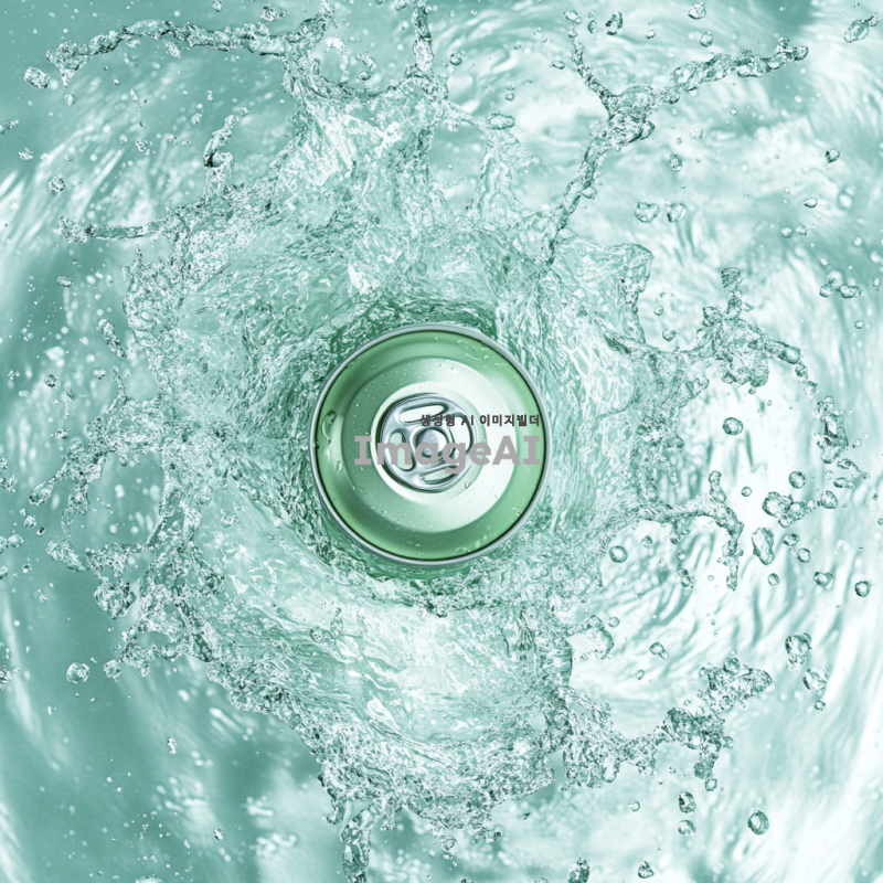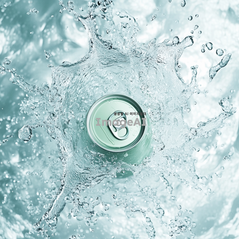 위에서 아래로 내려다보는 시점, 물이 튀기는 역동적인 장면, 중앙에 연한 녹색 캔 음료가 가로로 놓여 있고, 주변에 물이 튀기는 모습, 물방울이 생생하게 표현된 장면, 시원하고 청량한 느낌 강조.