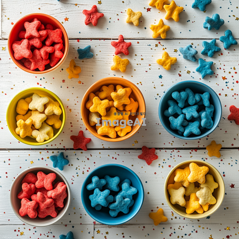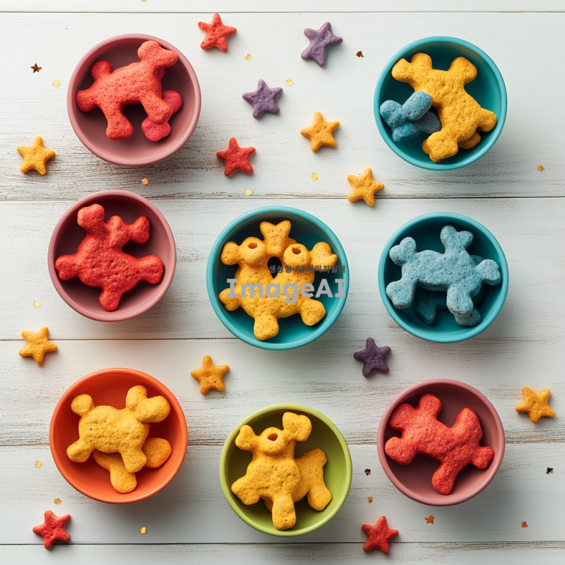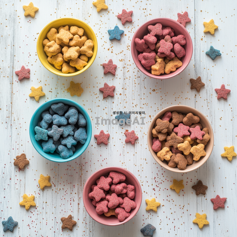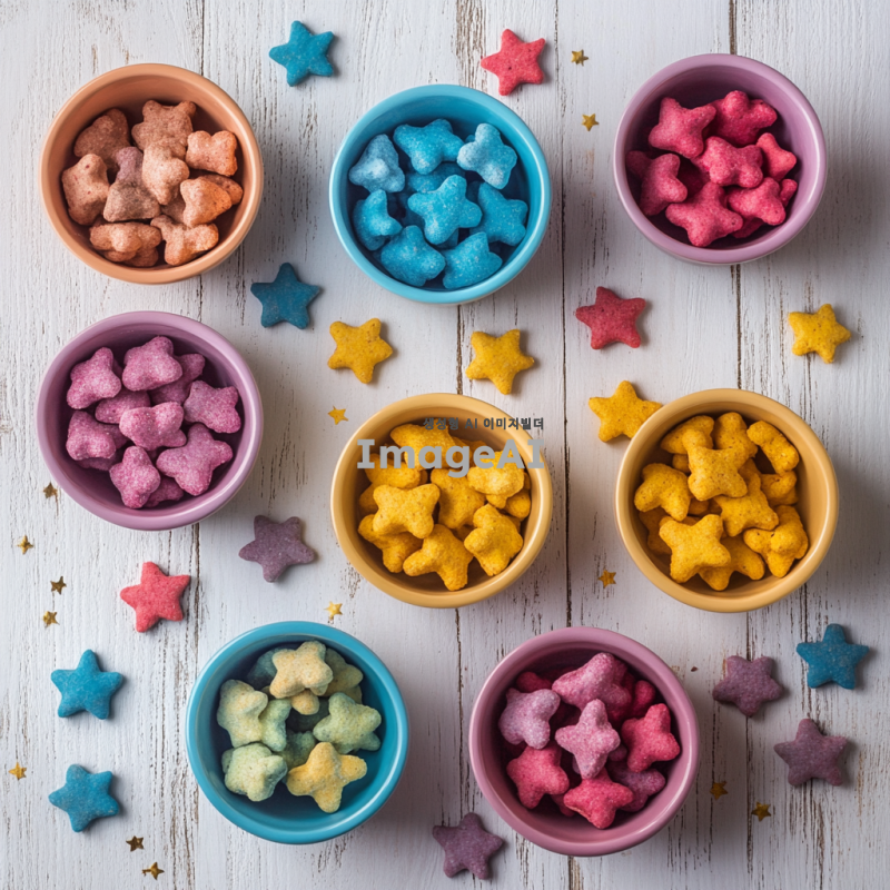 - 전문 사진 기법과 자연광을 사용하여 새의 눈으로 본 흰색 나무 배경 위의 다양한 색상의 개 간식 그릇, 고해상도 이미지로 촬영됨. 몇 개의 흩어진 별이 축제 분위기를 더해주는 이 간식의 질감과 색상 디테일을 전달함. 부드러운 조명으로 동물 테마 간식의 색상과 질감을 세부적으로 강조한 고품질 사진 스타일, 위에서 본 모습으로 제시됨.