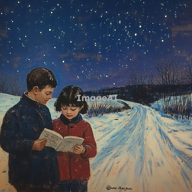 별이 빛나는 밤하늘을 보며 남녀가 시골 길 위를 걷고 있는 그림을 그려줘. 길은 사진의 한가운데에 있어. 그리고 겨울 분위기가 났으면 좋겠어. 눈이 쌓여 있는거야.