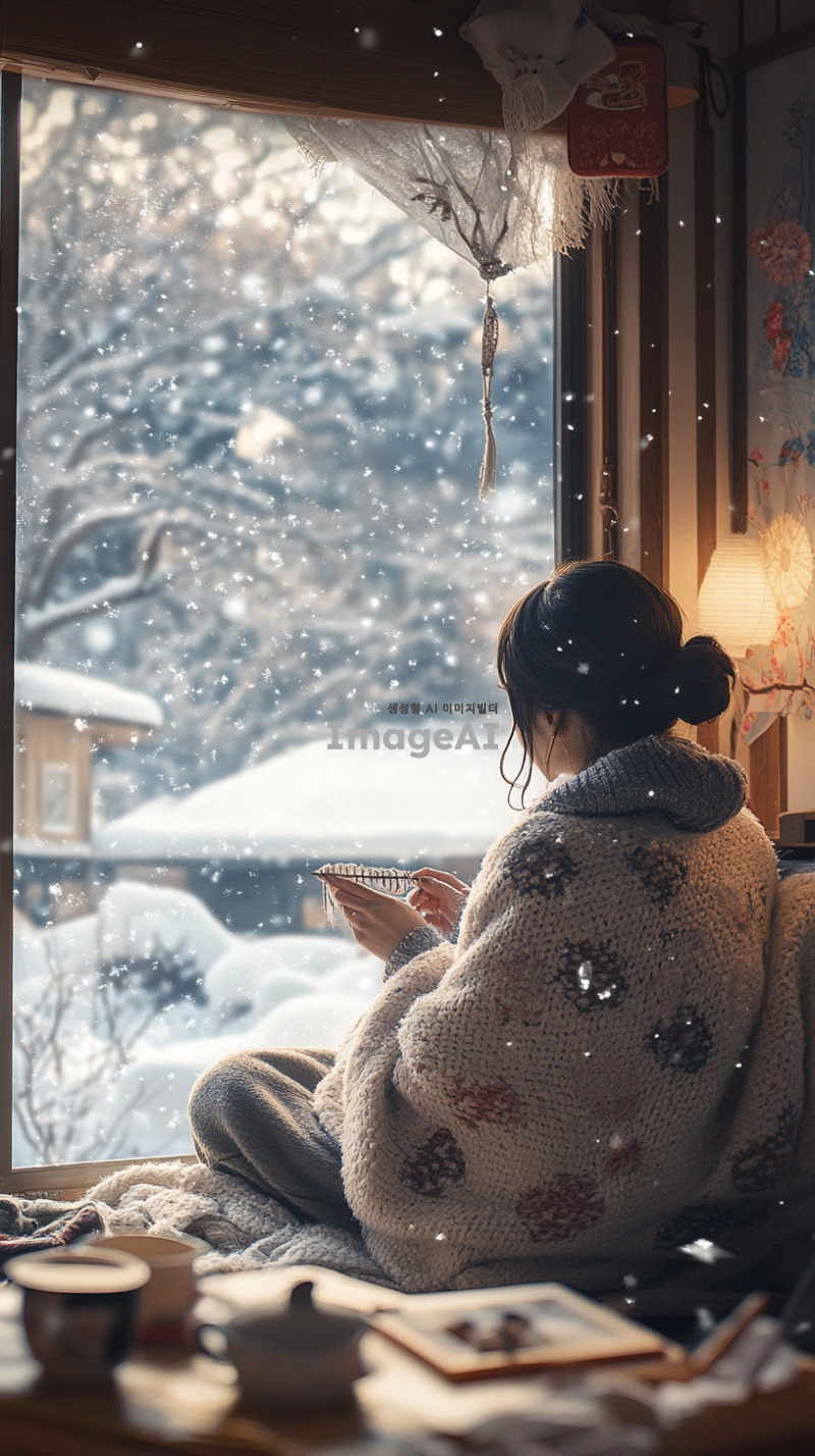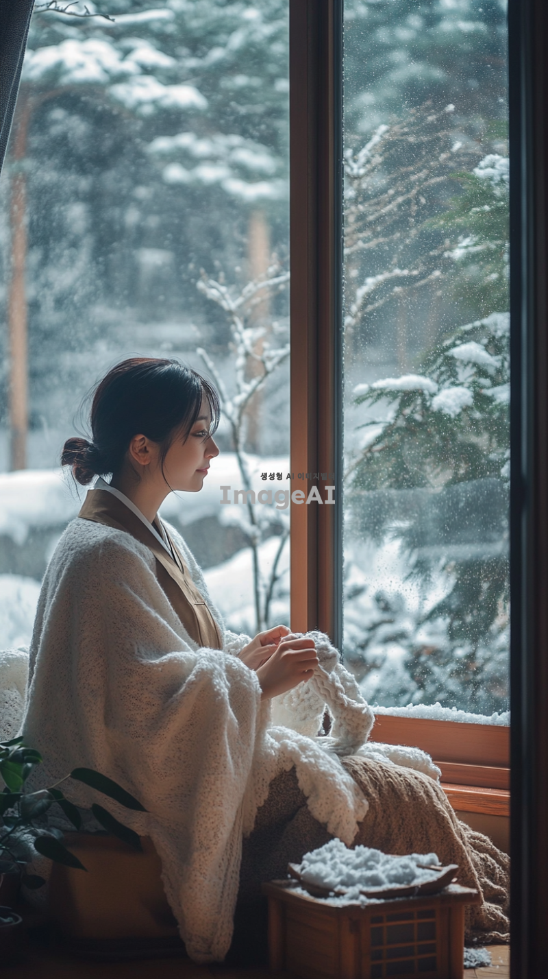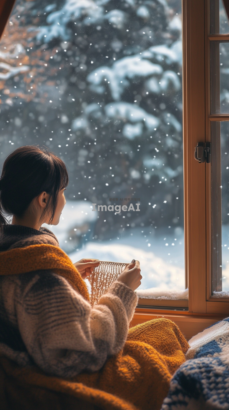 핸드폰 배경화면을 만들거야. 창문밖에는 눈이 쌓여있고 집안의 온기는 따뜻하게 느껴져. 여자는 무릎담요를 덮고 뜨개질을 하면서 창밖을 바라ㅂ고 있어.