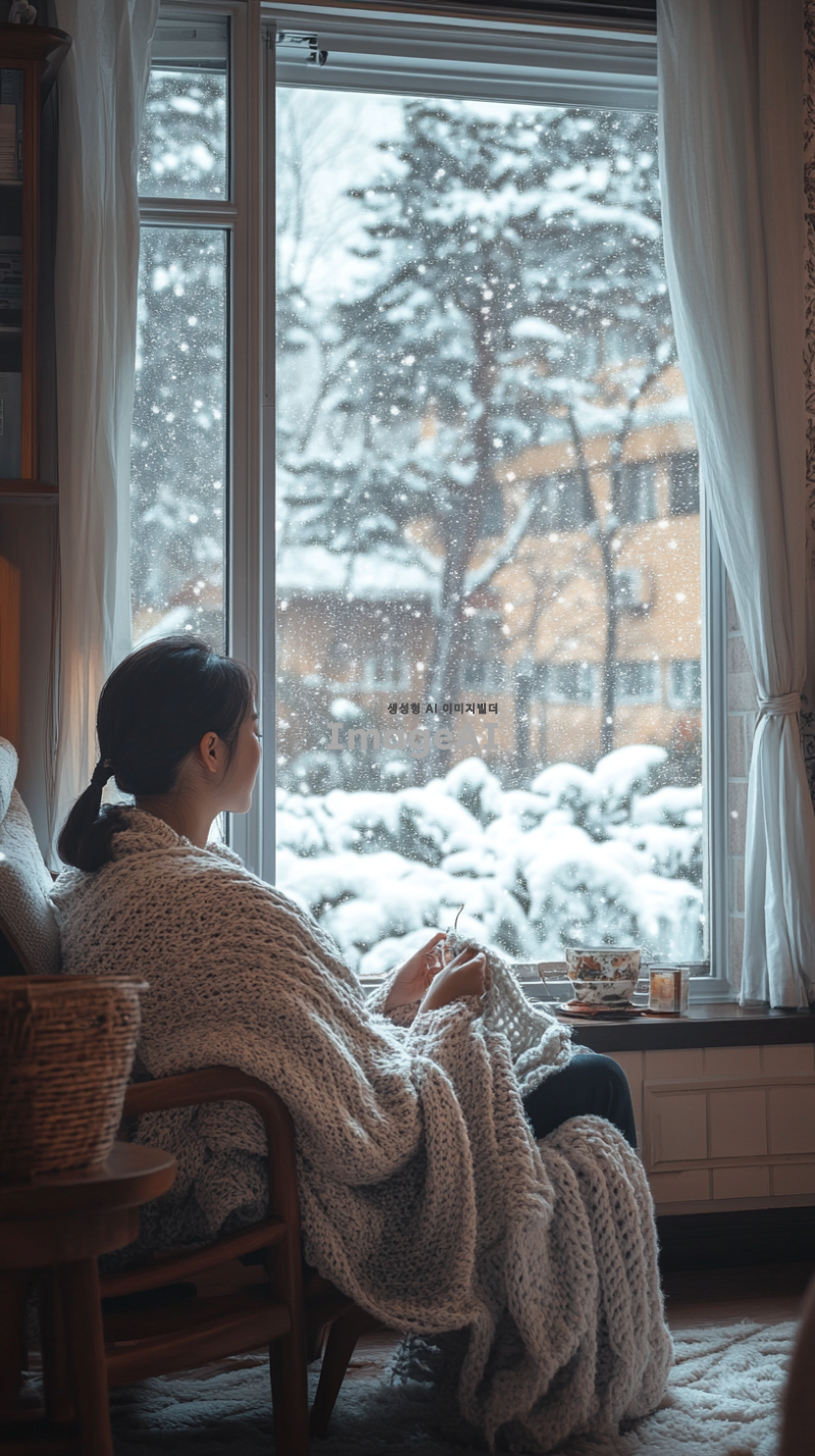 따뜻한 겨울 아침, 창문 밖에는 눈이 소복이 쌓여 있고, 집안은 아늑하고 따뜻한 분위기. 창가에 앉아 있는 한국인 여성이 무릎담요를 덮고 앉아 있으며, 손에는 뜨개질을 하고 있는 중. 그녀는 창밖의 눈 내리는 풍경을 바라보며 편안한 미소를 짓고 있다. 방 안은 부드러운 조명으로 따뜻한 느낌을 주며, 창문을 통해 들어오는 자연광이 눈부시게 비춰진다.