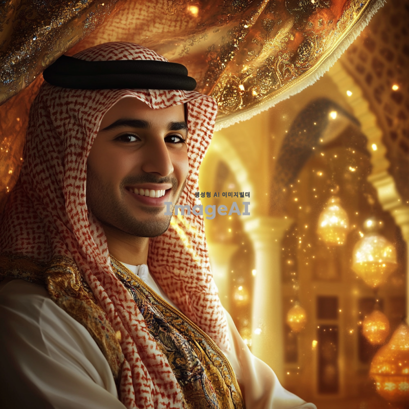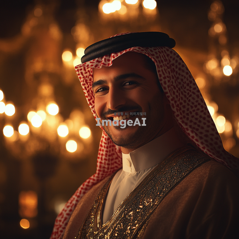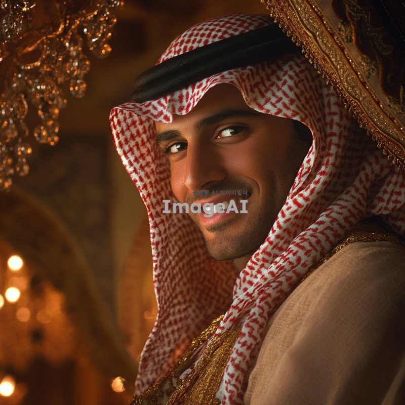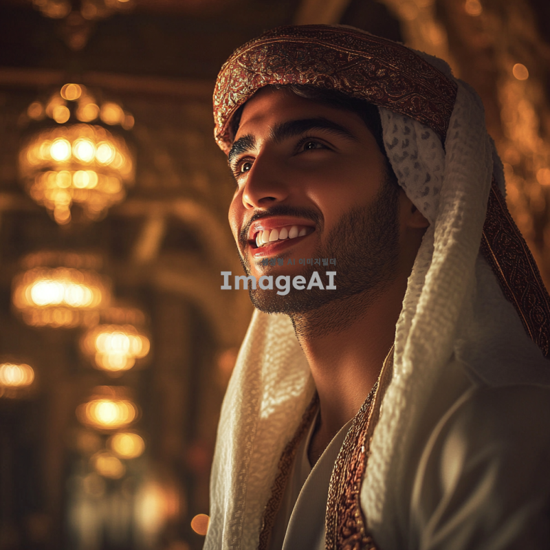 중동의 전통 의상을 입은 남성이 베일을 벗으면서 환하게 웃고 있는 모습, 배경은 화려한 중동 궁전의 내부, 따뜻한 조명 아래에서 빛나는 장식들이 가득한 장면, 남성의 표정은 즐겁고 환한 미소, 베일은 부드럽고 섬세한 천으로 표현, 궁전의 세부 장식은 정교하고 화려하게 나타냄.