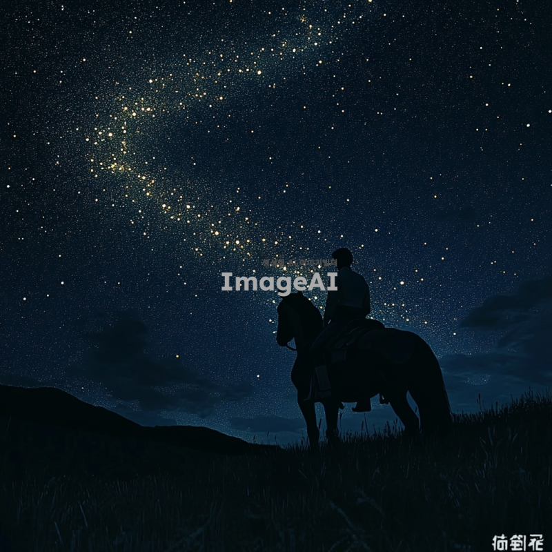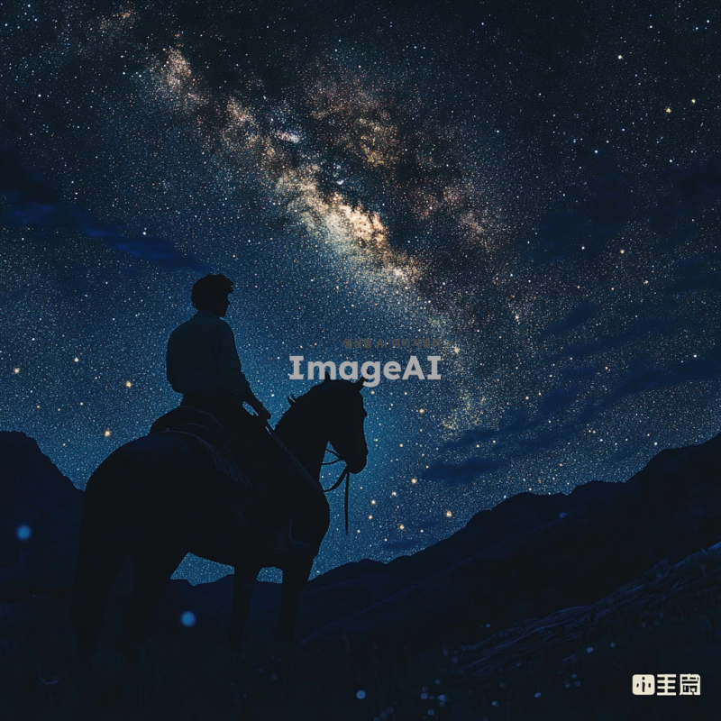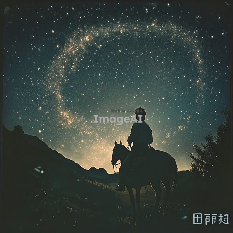 화면의 중앙에 말을 탄 남자가 밤하늘의 별을 보고 있다.