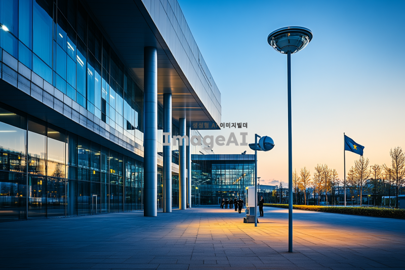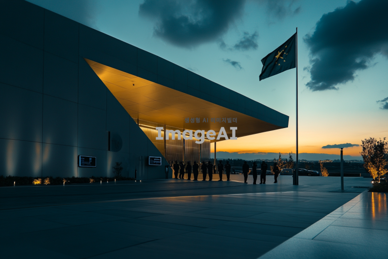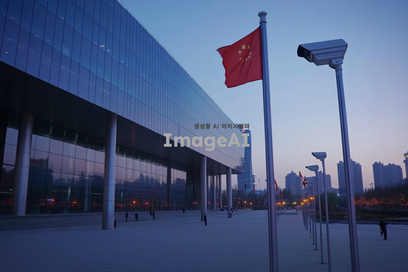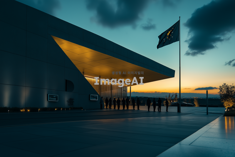 보안이 철저한 현대적인 정부 건물의 외관, 건물 주변에는 고해상도 감시 카메라와 보안 경비원이 배치되어 있으며, 건물 앞에는 국가를 상징하는 깃발이 바람에 휘날리고 있다. 건물의 구조는 견고하고 미래지향적이며, 주변은 깨끗하고 질서정연하다. 저녁 시간대에 조명이 은은하게 비추고 있어 건물의 위엄과 안전성을 강조한다.