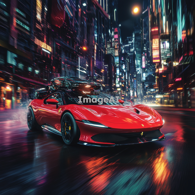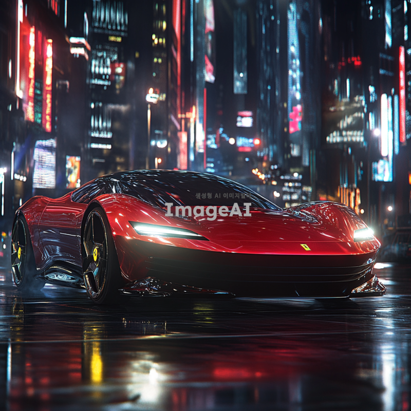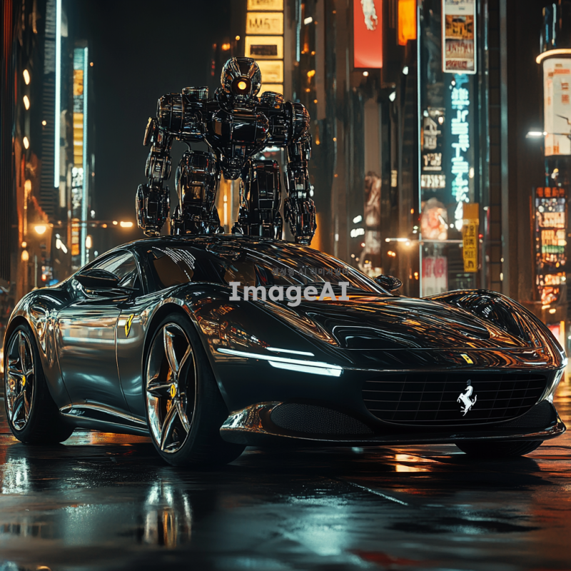 페라리 로마가 로봇으로 변신하는 장면, 트랜스포머 스타일, 미래적인 도시 배경, 빛나는 금속 표면과 기계적인 디테일 강조, 역동적인 포즈, 강렬한 색감, 자동차의 세부 디자인 요소가 로봇의 몸체에 통합된 모습, 주변에 에너지가 흐르는 듯한 효과, 선명하고 현대적인 분위기.