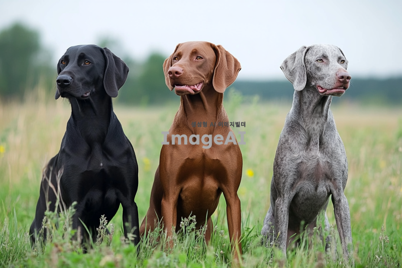 초원에 묶여있는 사냥개 세 마리가 있다. 사냥개들은 근육질의 몸매와 날렵한 털을 가지고 있으며, 각각의 사냥개는 다른 색상을 띠고 있다. 한 사냥개는 검은색, 다른 하나는 갈색, 마지막 사냥개는 회색이다. 이들은 강력하고 민첩해 보이며, 눈은 날카롭고 집중되어 있다. 사냥개들 앞에 먹이가 던져지자, 그들은 으르렁거리며 긴장감 있게 먹이를 향해 뛰쳐나가려는 자세를 취하고 있다. 주변은 푸른 초원과 맑은 하늘로 둘러싸여 있으며, 약간의 바람이 불어오는 듯한 느낌을 준다.