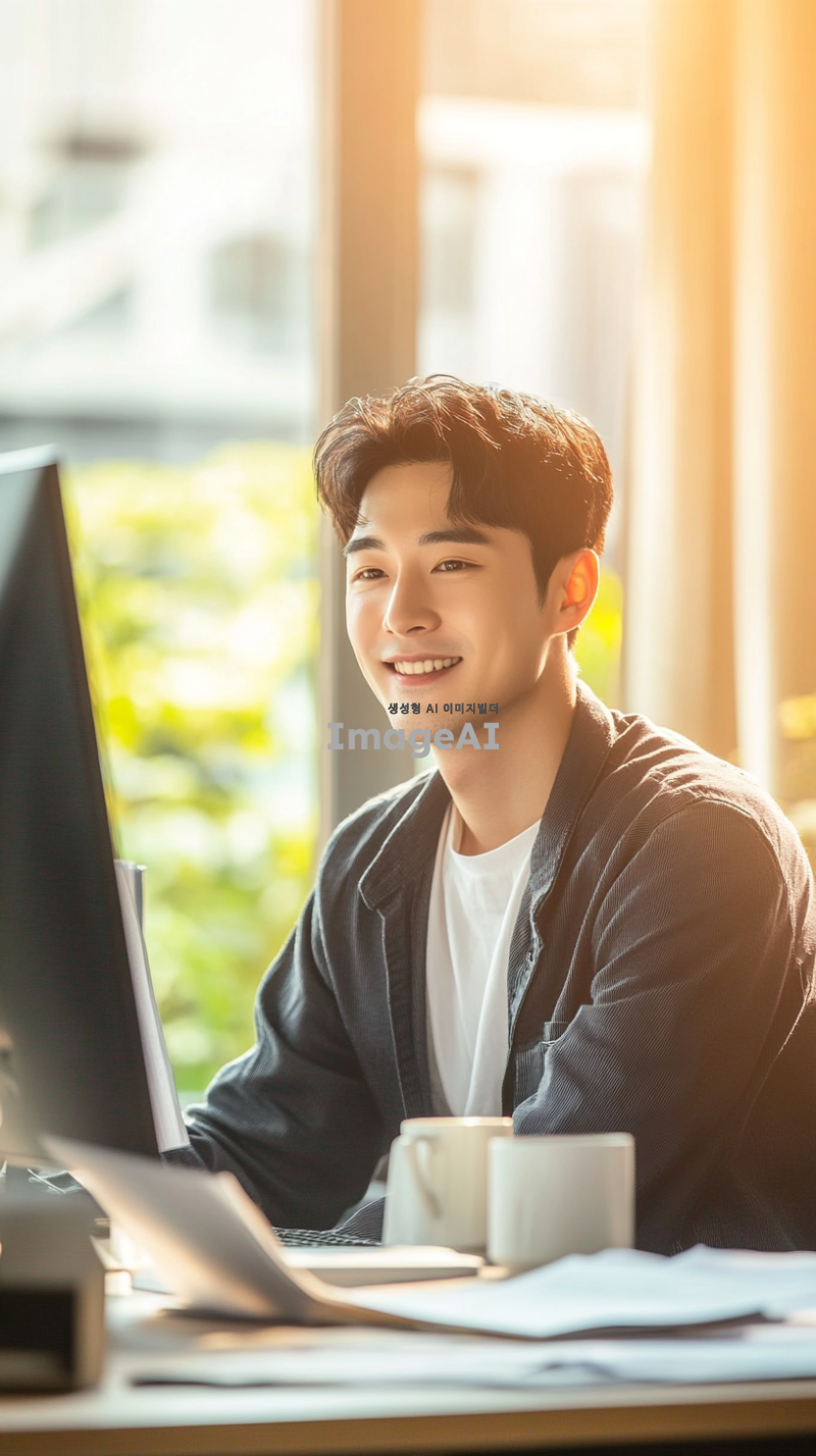 30대 한국인 남성이 사무실 책상에 앉아 근무복을 입고 컴퓨터 화면을 보고 웃고 있는 모습, 주변에는 서류와 커피잔이 놓여 있으며, 창문 밖으로는 밝은 햇살이 들어오는 장면, 현대적인 사무실 인테리어, 자연스러운 표정과 자세.