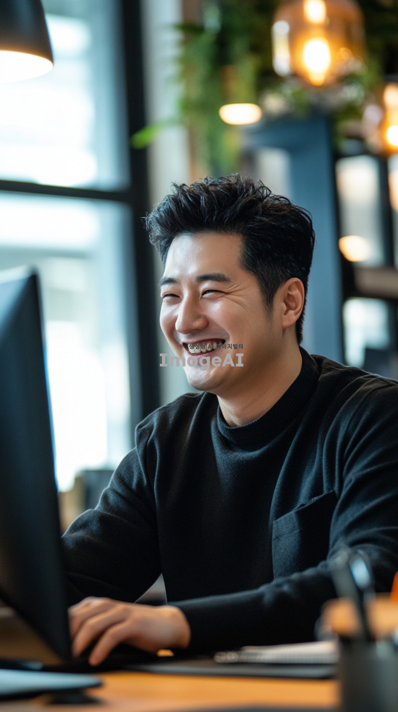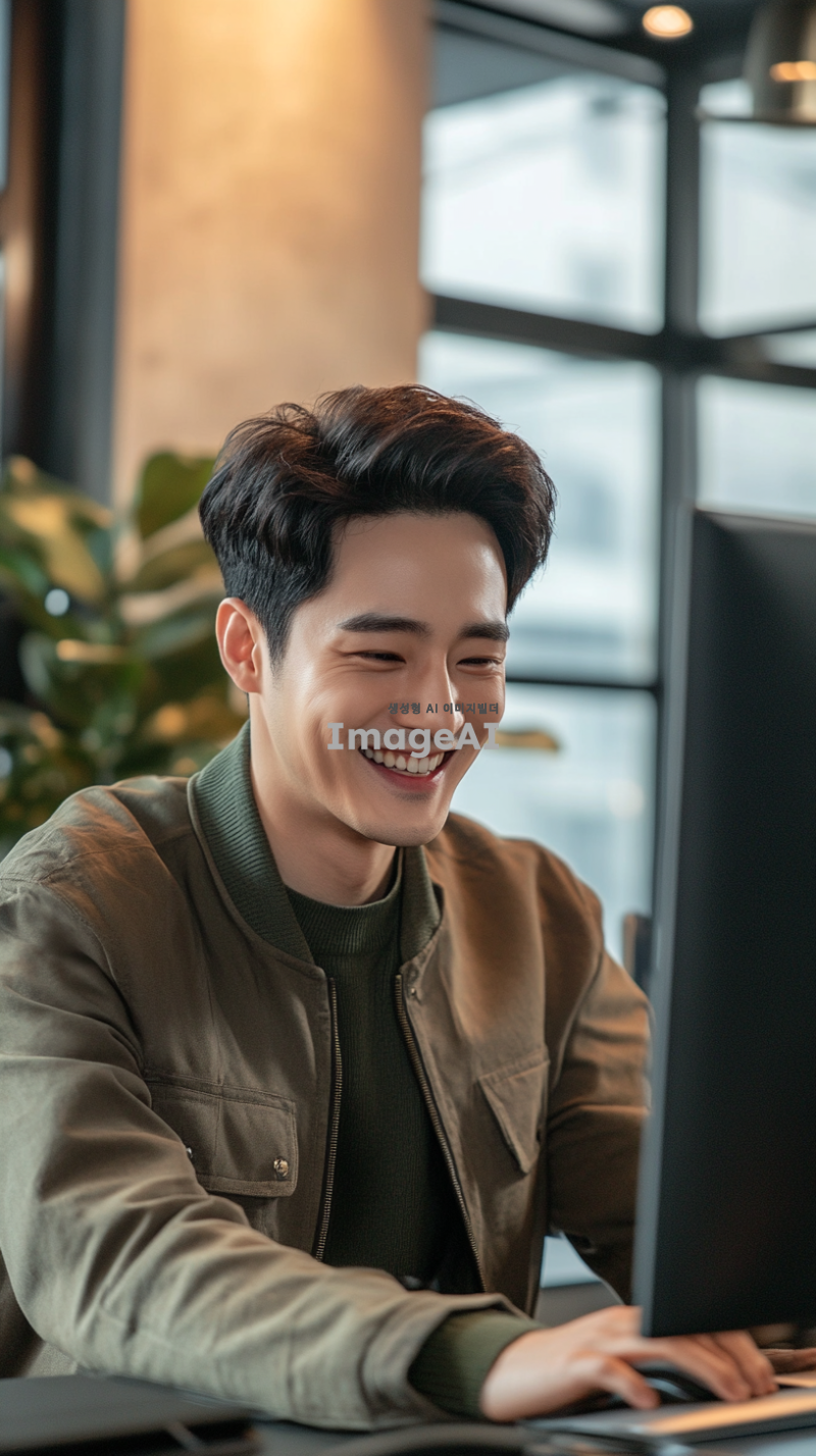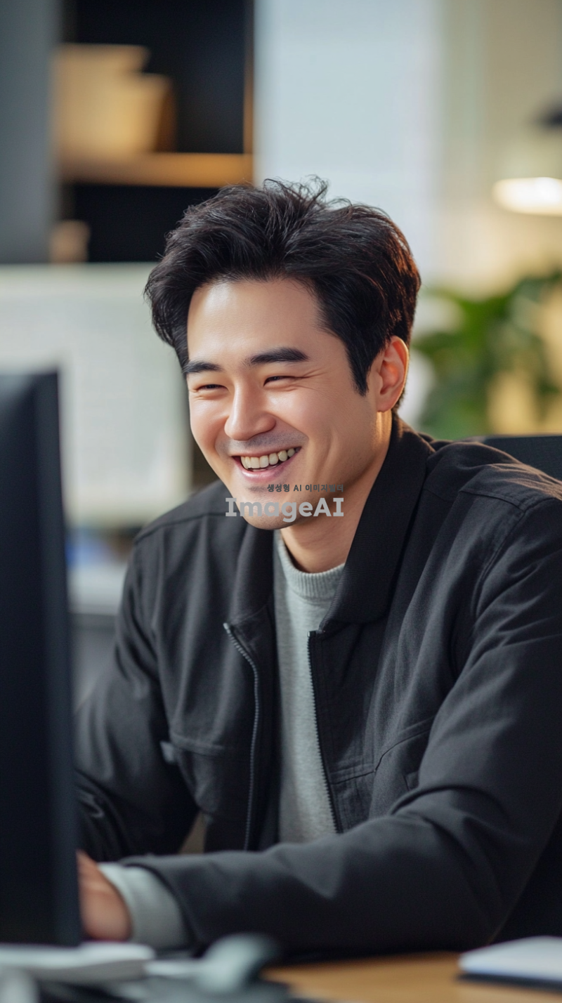 30대 한국인 남성이 근무복을 입고 컴퓨터 화면을 보며 미소 짓고 있는 장면, 사무실 배경, 자연스러운 조명, 현대적인 사무실 인테리어, 남성의 표정은 즐거움과 만족감이 느껴지도록 표현.