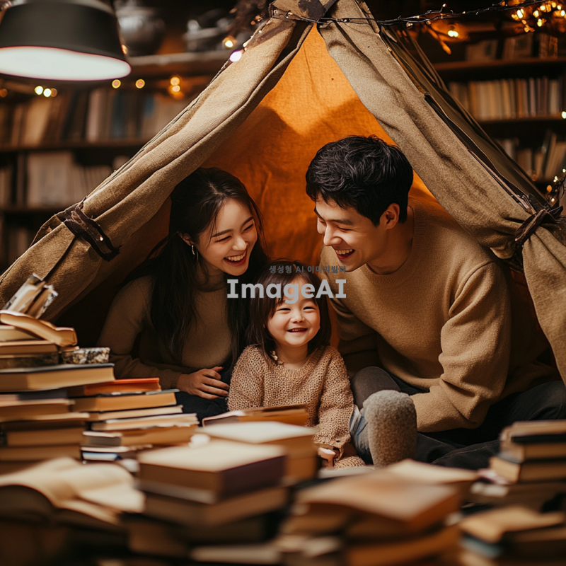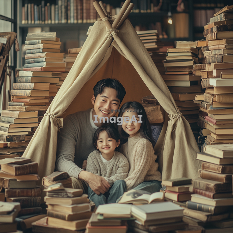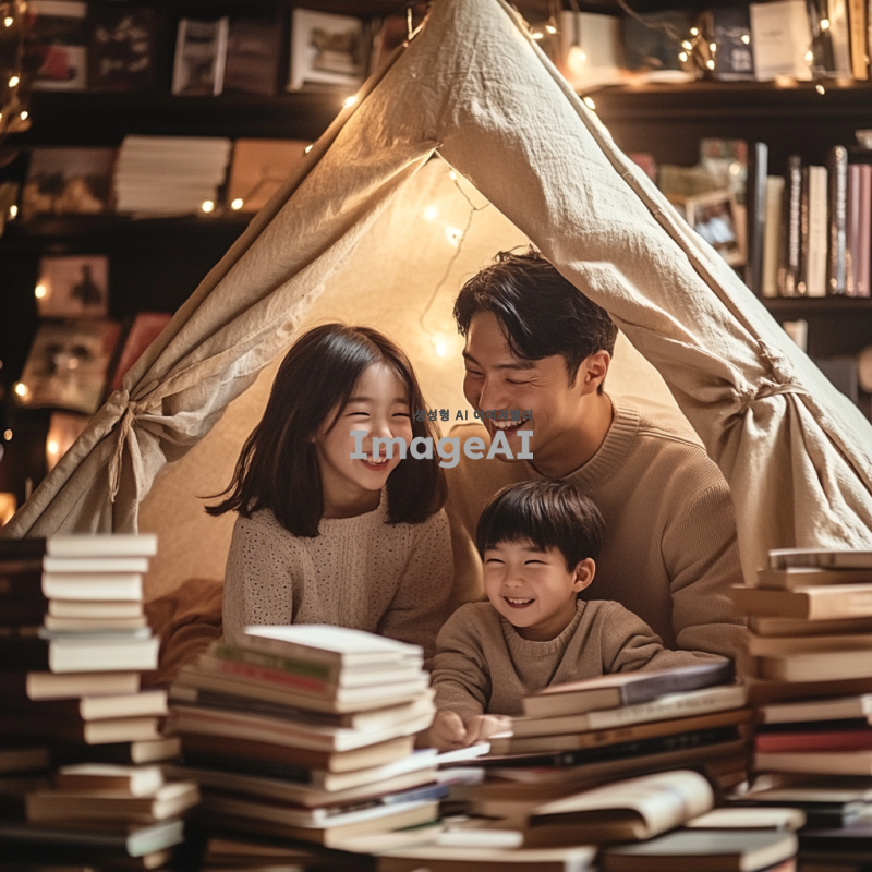책으로 만들어진 텐트 안에서 행복하게 웃고 있는 한국인 가족, 두 아이와 부모가 함께 앉아 있는 모습, 따뜻하고 아늑한 분위기, 주변에 책들이 쌓여 있는 장면, 부드러운 조명과 자연스러운 색감, 가족의 얼굴에 행복한 미소가 가득한 장면.
