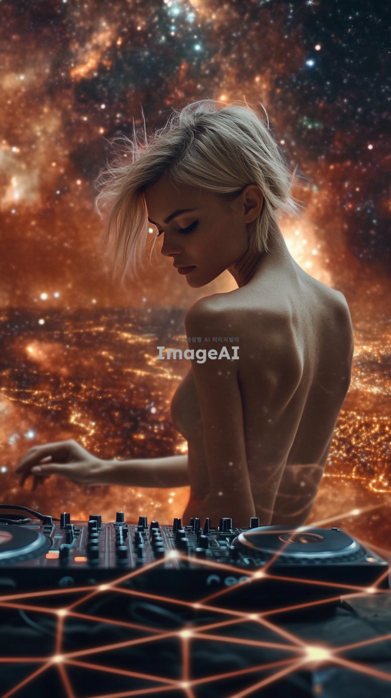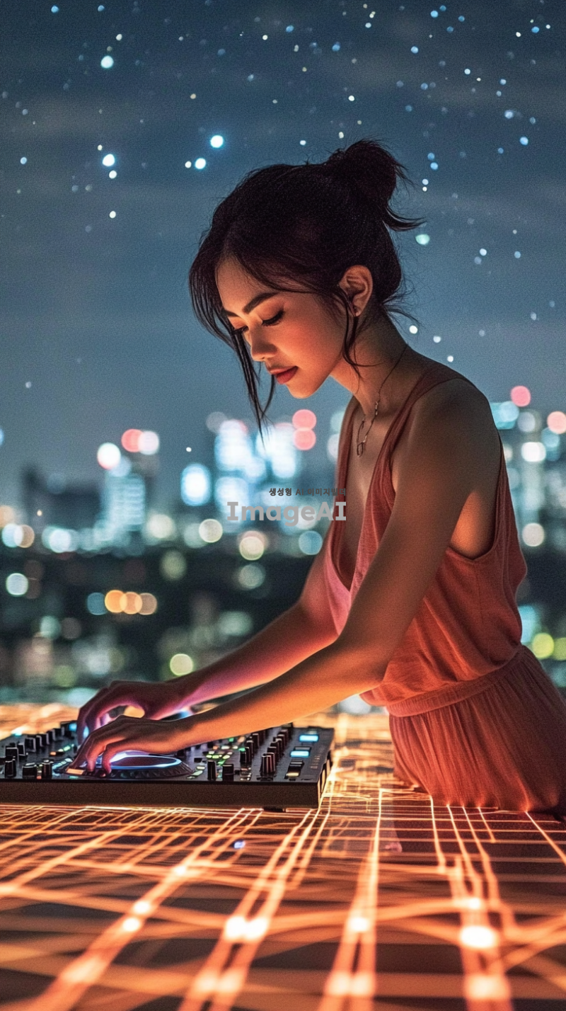 아름다운 여성 DJ가 야경이 아름다운 야외에서 공연 중이며, 자신감 있고 매력적으로 정면을 바라보고 있는 모습. 그녀는 따뜻한 저녁에 어울리는 시원하고 스타일리시한 의상을 입고 있으며, DJ 믹서 위에 손을 올리고 있는 장면. 그녀의 뒤에는 넓고 몰입감 있는 배경이 펼쳐지며, 멋진 도시 스카이라인이나 자연 풍경이 활기찬 조명에 의해 밝혀져 있고, 하늘에는 별들이 반짝이고 있음. 이 장면은 16:9 비율로 구성되어 우아하고 생동감 넘치는 분위기를 연출.
