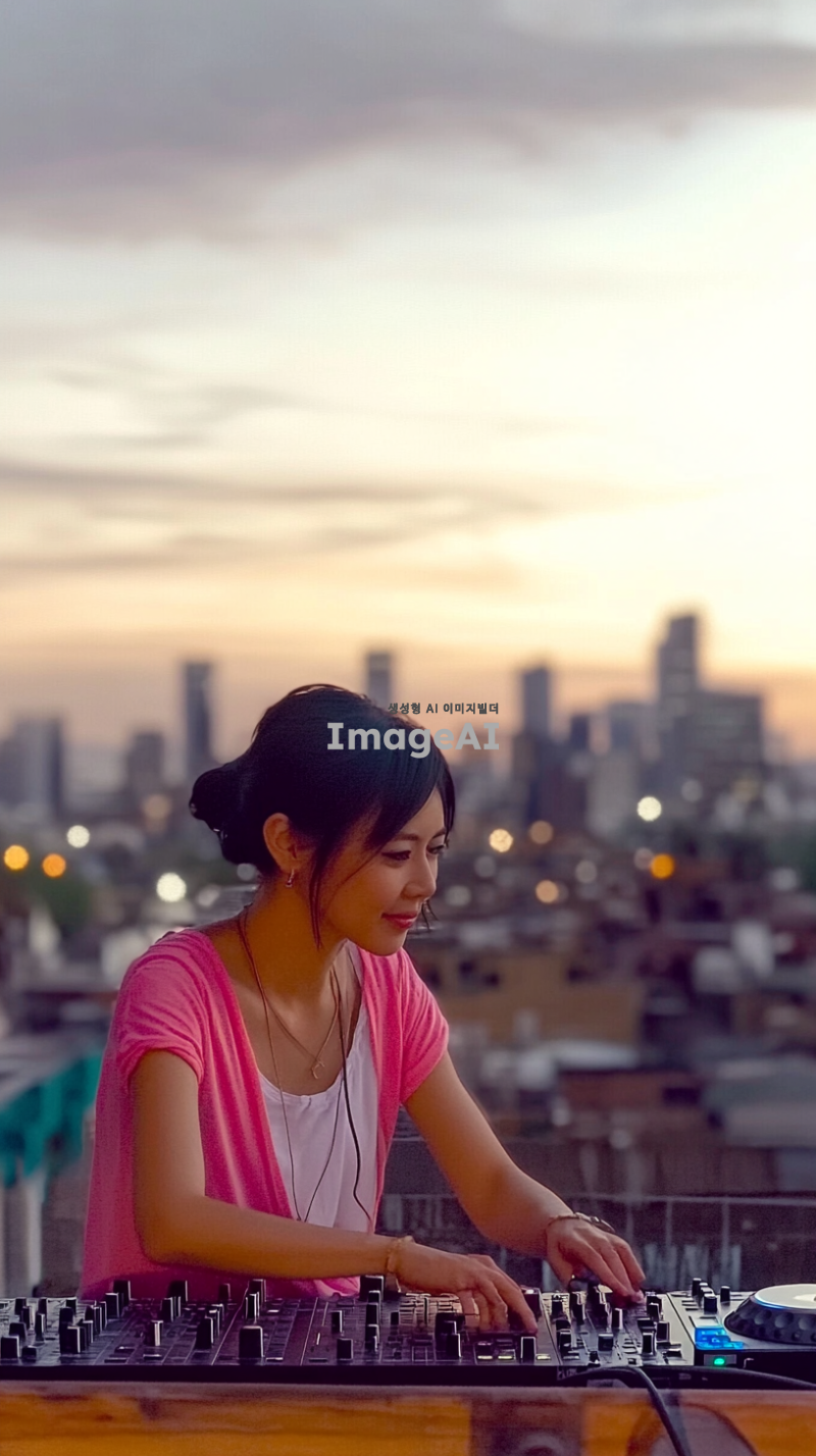 "아름다운 여성 DJ가 야경이 아름다운 야외에서 공연 중이며, 자신감 있고 매력적으로 정면을 바라보고 있습니다. 그녀는 따뜻한 저녁에 어울리는 시원하고 스타일리시한 의상을 입고 있으며, DJ 믹서 위에 손을 올리고 있습니다. 그녀의 뒤에는 넓고 몰입감 있는 배경이 펼쳐지며, 멋진 도시 스카이라인이나 자연 풍경이 활기찬 조명에 의해 밝혀져 있고, 하늘에는 별들이 보입니다. 이 장면은 16:9 비율로 구성되어 우아하고 생동감 넘치는 분위기를 연출합니다."