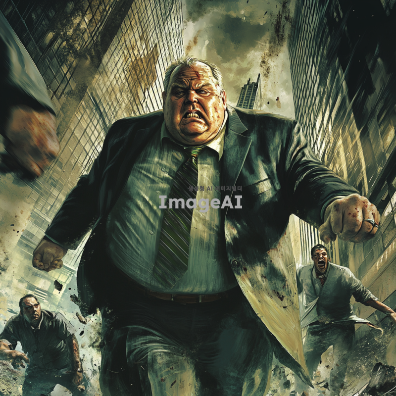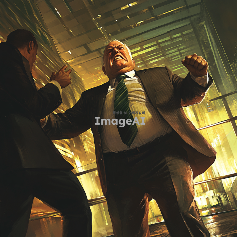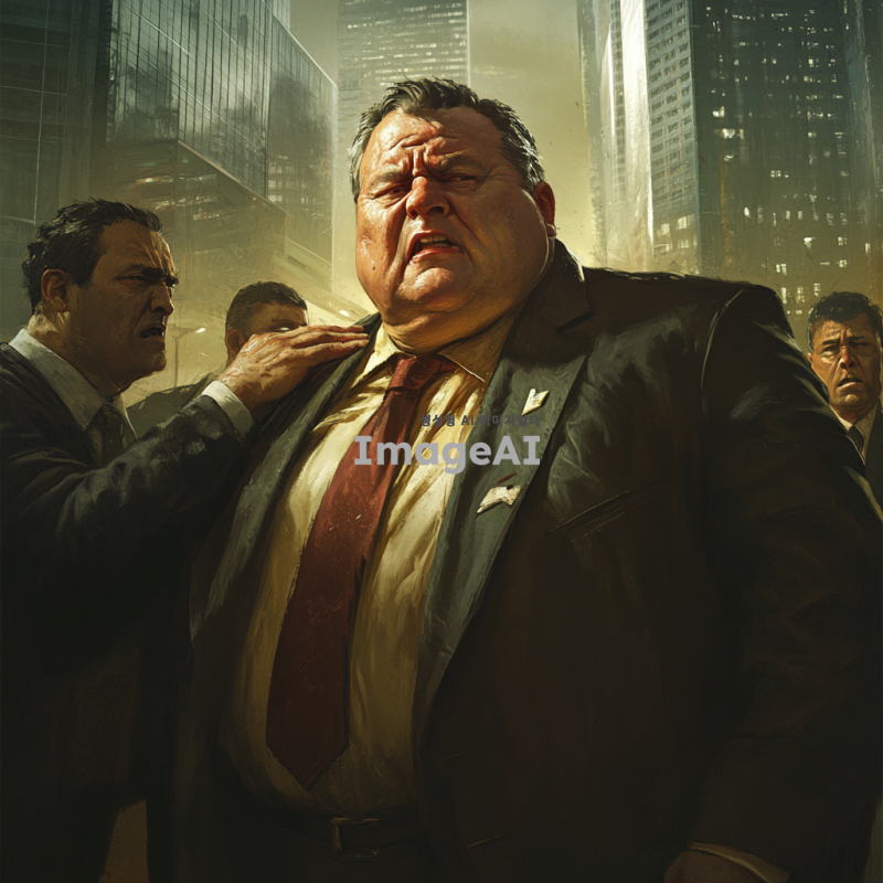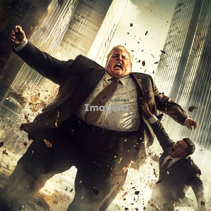 60대 남성, 뚱뚱한 체형의 정치인이 정장 차림으로 서 있는 장면, 한 시민이 정치인의 멱살을 잡고 끌어내리는 역동적인 장면. 배경에는 현대적인 도시 풍경이 보이며, 긴장감 넘치는 분위기. 시민들은 분노와 결심에 찬 표정을 짓고 있으며, 정치인은 당황한 표정. 자연스러운 조명과 생생한 색감으로 표현된 이미지.