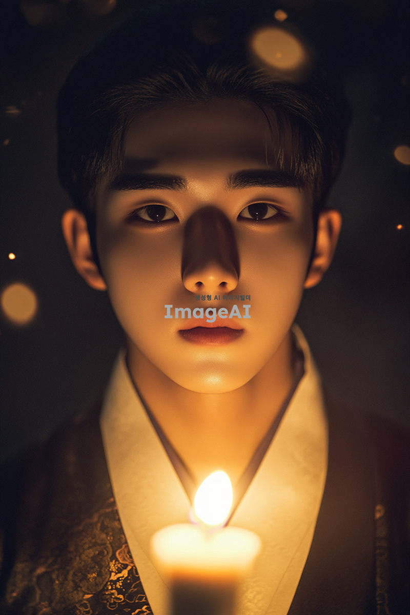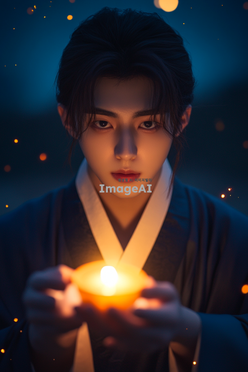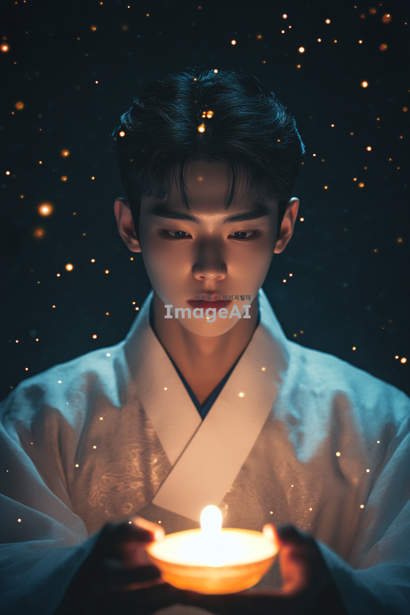 20대 젊고 매력적인 신비로운 남성, 별빛과 촛불의 잔잔하고 신비로운 이미지를 의인화, 한국 전통적 의상 착용, 은은한 빛이 감도는 달이 떠있는 어두운 밤하늘의 배경, 부드럽고 신비로운 분위기, , 별빛처럼 반짝이는 눈, 촛불의 따뜻한 빛이 얼굴을 비추는 모습, 고요하고 평화로운 느낌, 전통적인 한국의 정취가 느껴지는 세부 묘사.