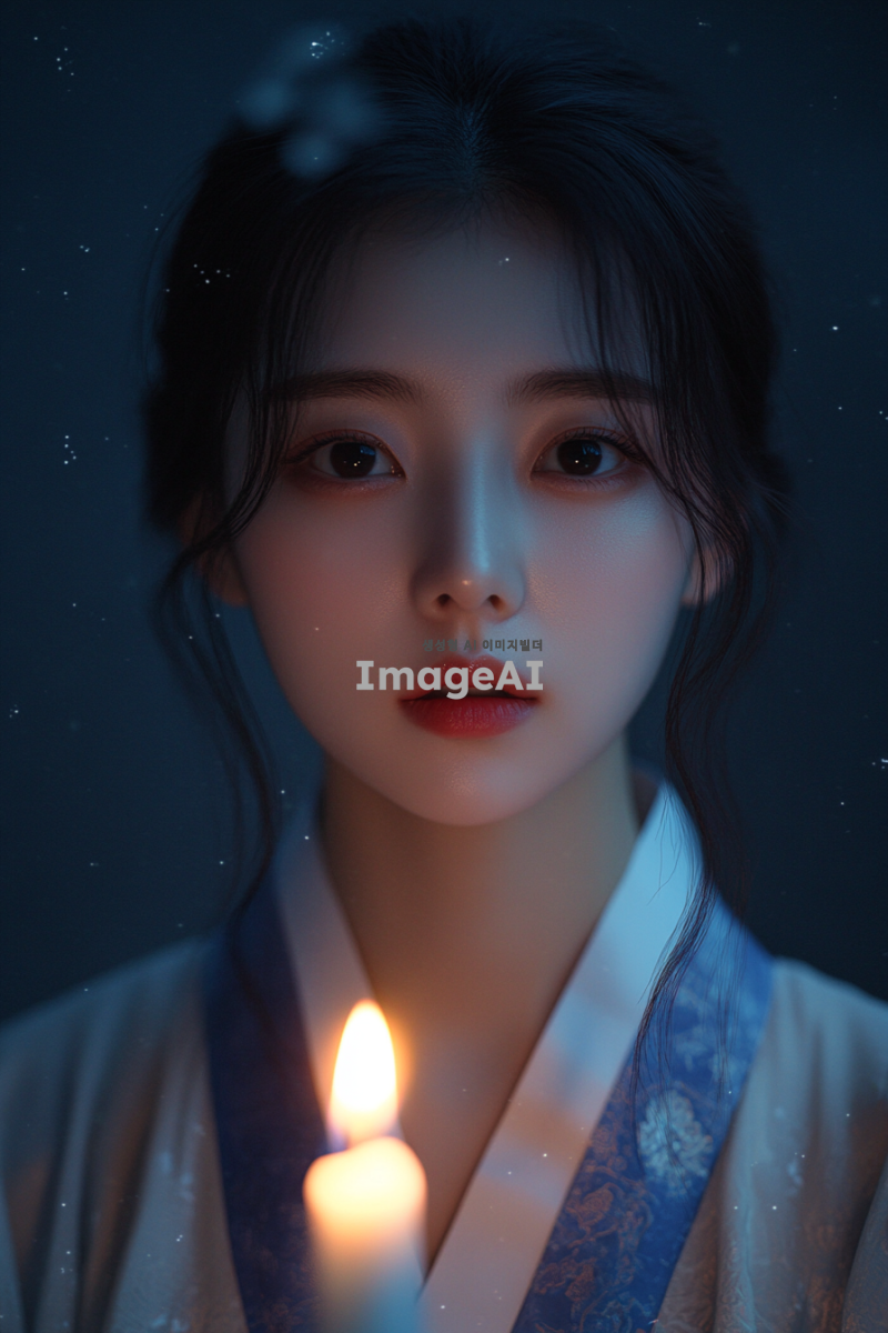 20대 젊고 매력적인 신비로운 여성, 별빛과 촛불의 잔잔하고 신비로운 이미지를 의인화한 모습, 한국 전통적 의상 착용, 은은한 빛이 감도는 달이 떠있는 어두운 밤하늘을 배경으로, 부드럽고 신비로운 분위기, 별빛처럼 반짝이는 눈, 촛불의 따뜻한 빛이 얼굴을 비추는 모습, 고요하고 평화로운 느낌, 전통적인 한국의 정취가 느껴지는 세부 묘사.