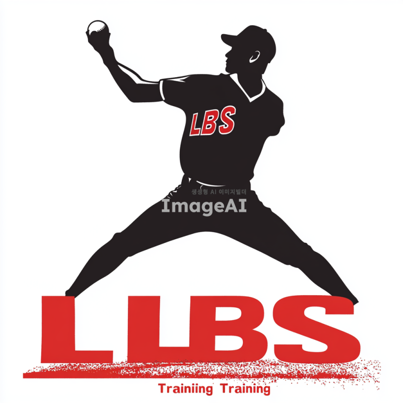 검정색 실루엣으로 자연스럽게 공을 던지는 투수의 모습, 투수의 유니폼에는 작게 "LBS"라고 적혀 있음. 이미지 하단에 한줄로 크게 "LBS Training"이라는 글자, "LBS"는 빨간색, "Training"은 하얀색으로 표현. 글자는 깔끔하고 직관적인 스타일.