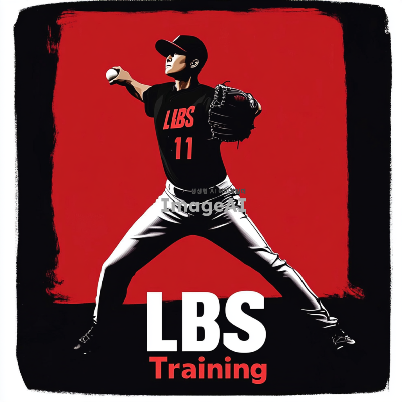 한국인 투수가 투구하는 역동적인 실루엣을 검정색으로 표현,투수의 유니폼에는 작게 LBS라고 적혀져있음. 하단에 "LBS Training"이라는 글자를 빨간색과 흰색의 조화로 크게 배치, 글자는 직관적이고 선명한 스타일로 디자인.