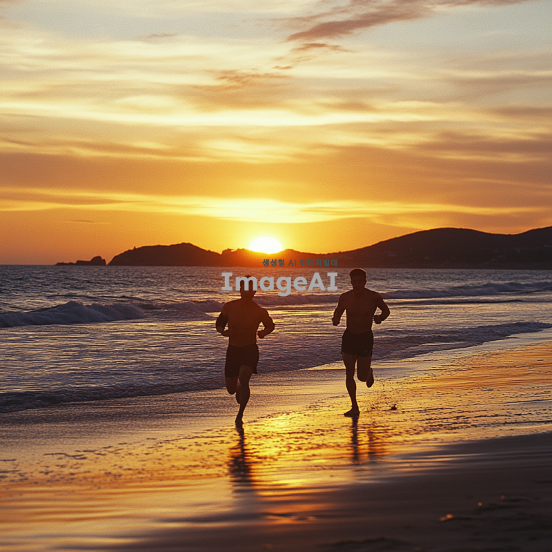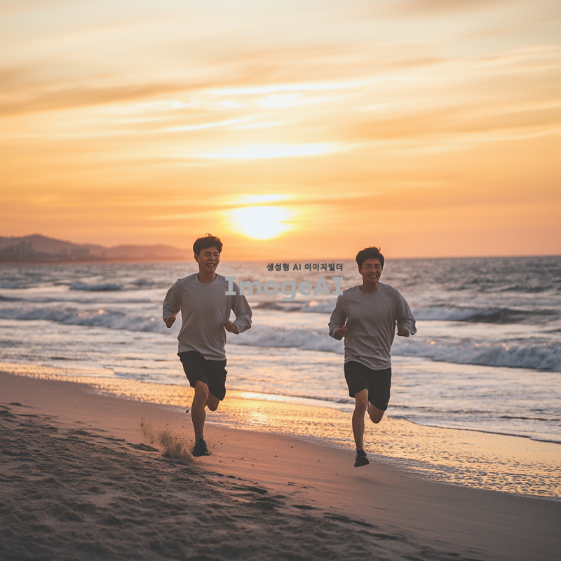 바닷가에서 뛰어다니는 한국인 남자 두 명, 배경에는 황금빛 노을이 지고 있으며, 하늘은 오렌지와 핑크빛으로 물들어 있음. 바다의 잔잔한 파도와 모래사장이 조화를 이루며, 남자들은 즐거운 표정으로 활기차게 움직이고 있음. 자연스럽고 생동감 있는 장면, 따뜻하고 평화로운 분위기.