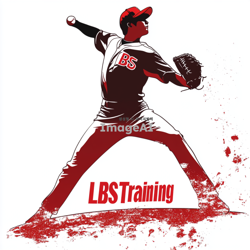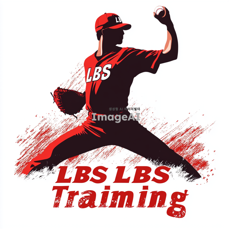 와인드업 자세를 취하는 한국인 투수의 검정색 실루엣, 유니폼에 작게 "LBS" 삽입. 실루엣 아래에 "LBS Training"을 큰 빨간색 글자로 한 줄로 삽입. 그림은 사실적이면서도 간단하고 명료하게 표현.