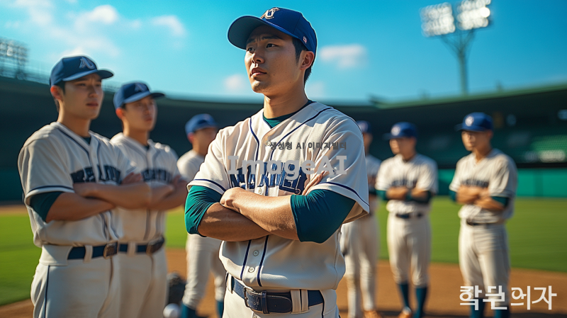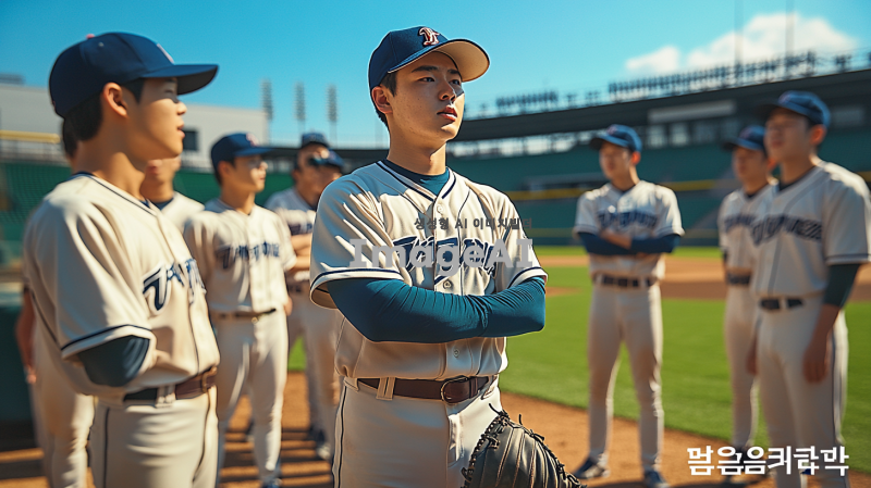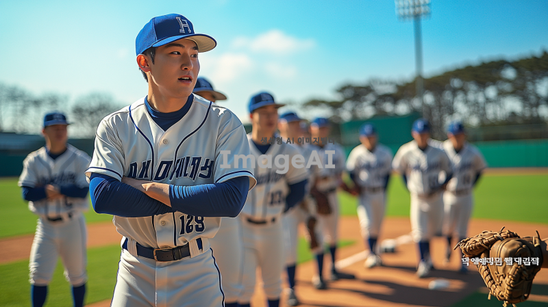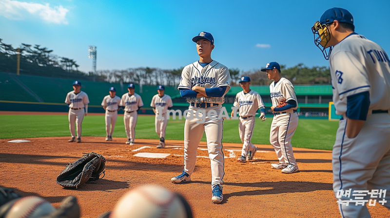 야구 경기 전, 푸른 하늘 아래 야구장에서 여러 명의 한국인 야구 선수들이 준비운동을 하고 있는 장면. 선수들은 스트레칭과 러닝 등 다양한 준비운동을 하고 있으며, 그 중 한 명의 선수는 다른 선수들과 달리 준비운동을 하지 않고, 팔짱을 끼고 준비운동 하기 싫다는 표정을 짓고 있는 모습. 선수들의 유니폼은 흰색과 파란색으로 구성되어 있고, 주변에는 야구 장비들이 놓여 있으며, 잔디가 푸르게 펼쳐져 있는 배경.