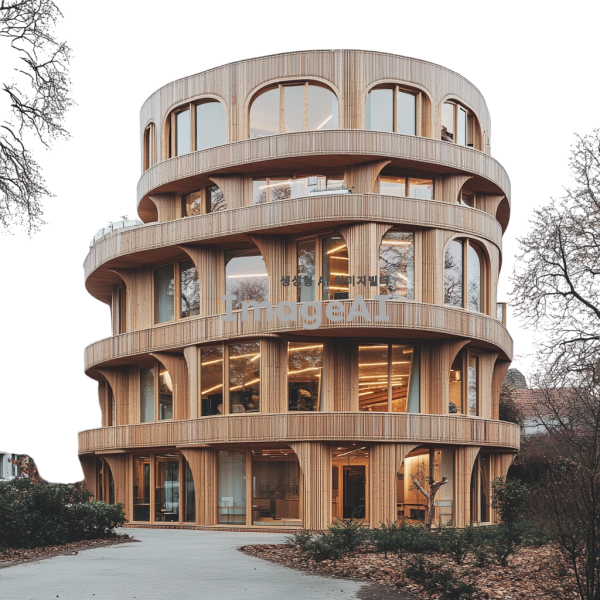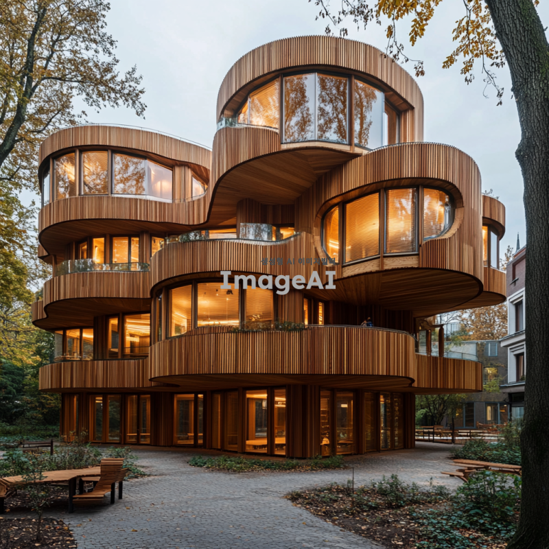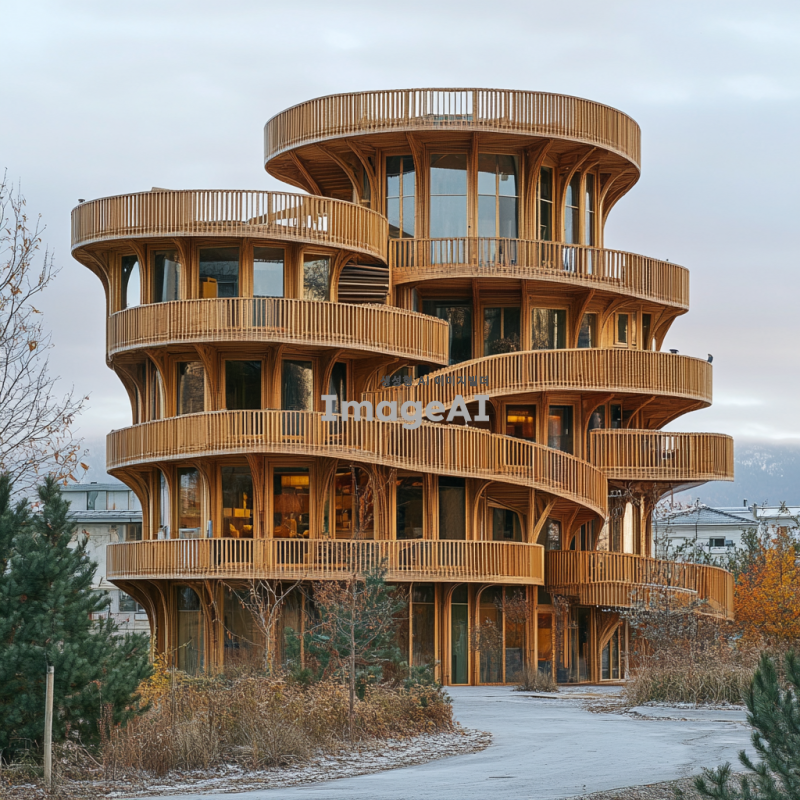 곡선의 아름다움이 강조된 나무 카프라 블록으로 쌓은 4층 건물과 전망대. 각 층마다 엇갈리며 쌓인 구조로, 유기적인 곡선 형태가 돋보이며, 나무의 따뜻한 질감이 잘 표현된 디자인. 건물 외부는 자연과 조화를 이루는 형태로, 창의적인 건축미를 강조. 사람 없이 건물만 있는 모습.