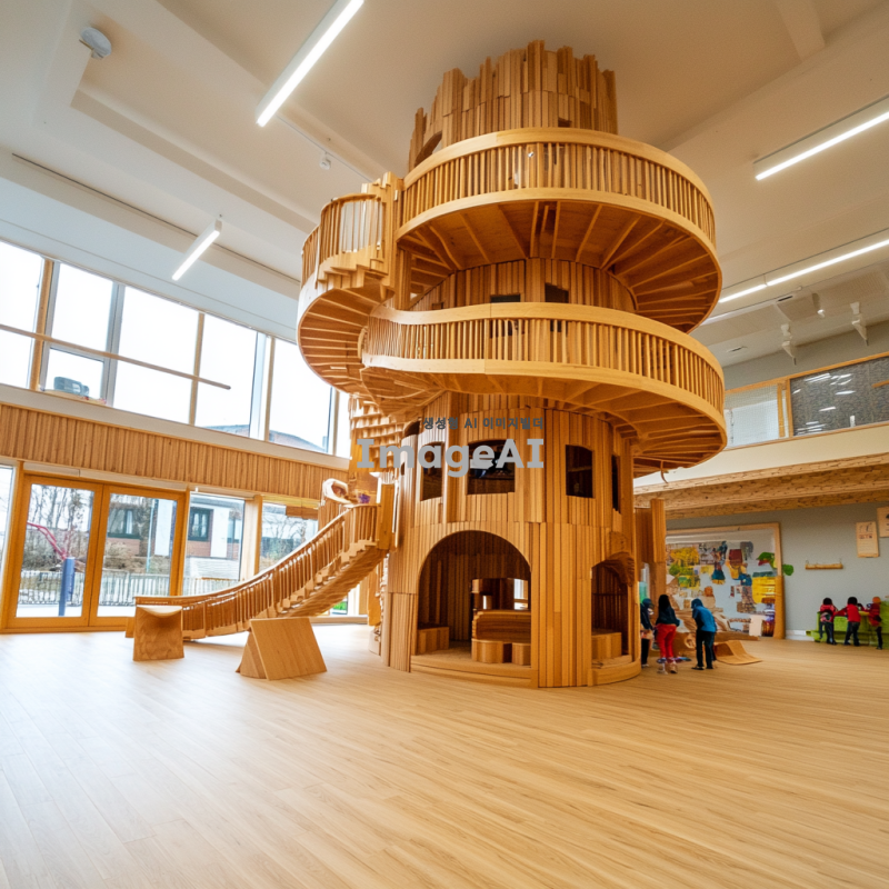 초등학교 영재 아이들이 나무 카프라로 쌓은 4층 높이의 건물과 전망대, 곡선의 아름다움을 강조한 디자인, 창의적이고 독창적인 구조, 자연스러운 나무의 색감과 질감을 살린 모습, 아이들이 즐겁게 참여하는 모습, 밝고 활기찬 분위기.