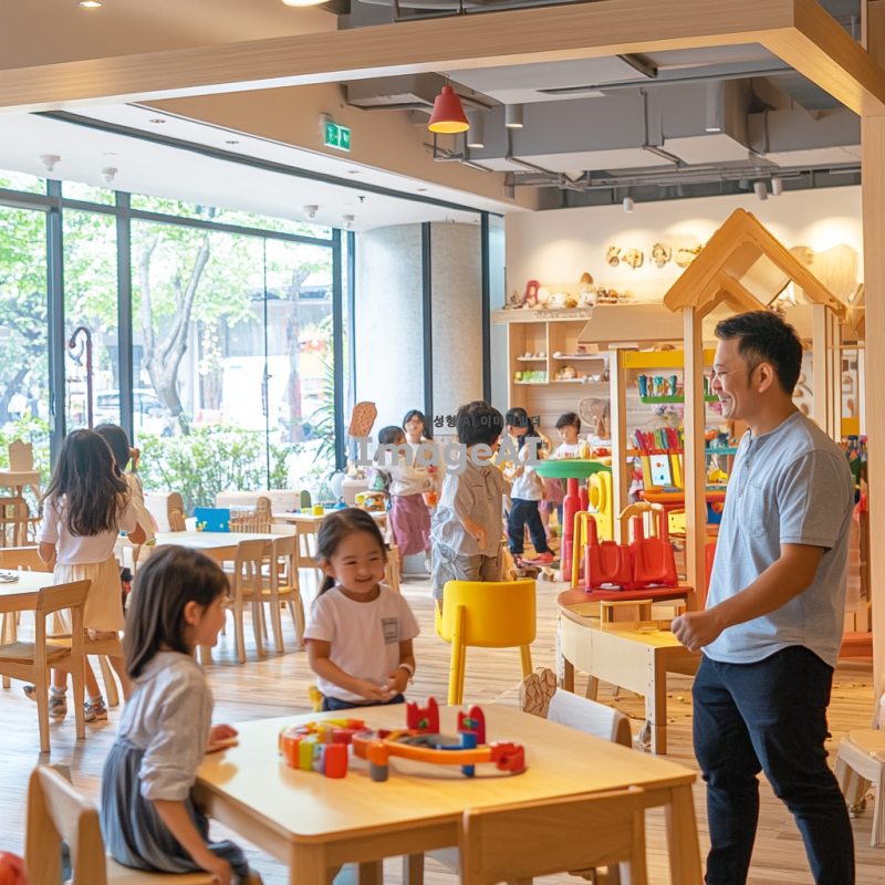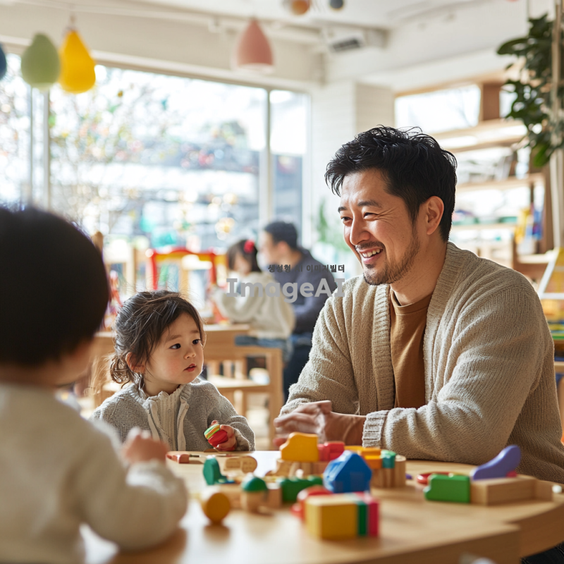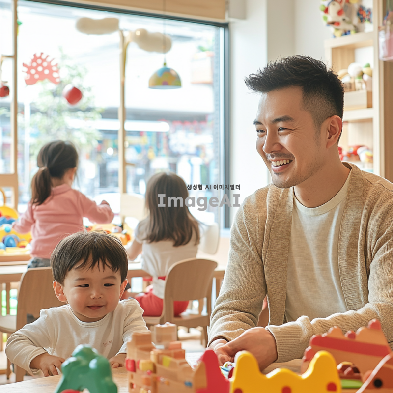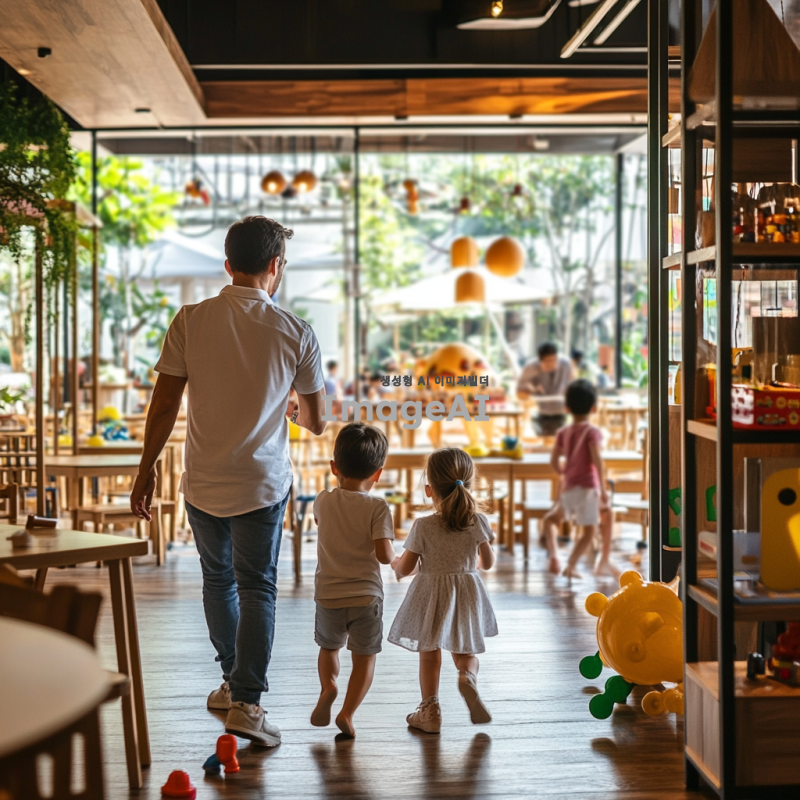 밝고 화사한 키즈카페 내부, 다양한 놀이기구와 장난감이 가득한 공간, 환하게 웃으며 아이들을 바라보는 아빠, 캐주얼한 옷차림, 주변에 뛰어노는 아이들, 따뜻하고 친근한 분위기, 자연광이 비추는 실내, 아빠의 얼굴에 자상한 미소, 아이들과 함께 즐거운 시간을 보내는 모습.