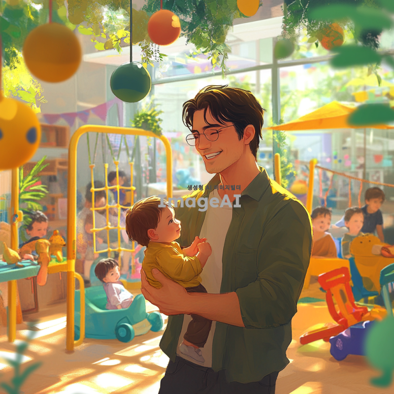 밝고 활기찬 키즈카페 내부에서 아기를 돌보고 있는 젊은 아빠, 주변에는 다양한 색상의 놀이기구와 장난감들이 가득하며, 아빠는 아기를 보며 미소짓고 있다. 아빠는 캐주얼한 옷을 입고 있으며, 배경은 아이들이 뛰어노는 모습을 담고 있다. 애니메이션 스타일로 표현된 장면, 따뜻하고 친근한 분위기.