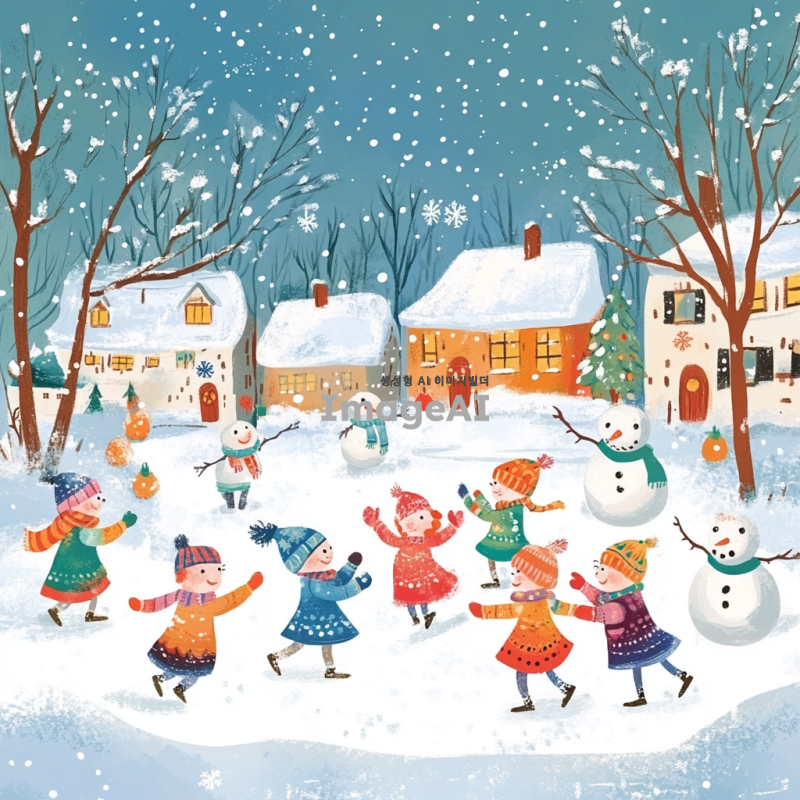 겨울 배경의 눈 덮인 마을에서 눈싸움을 즐기는 아이들, 따뜻한 옷을 입고 있는 아이들이 밝게 웃으며 눈덩이를 던지고 있는 장면, 주변에는 눈사람과 눈으로 덮인 나무들, 하늘에는 눈송이가 천천히 떨어지는 모습, 애니메이션 스타일로 귀엽고 밝게 표현된 생동감 있는 색감과 부드러운 라인, 밝고 즐거운 분위기.