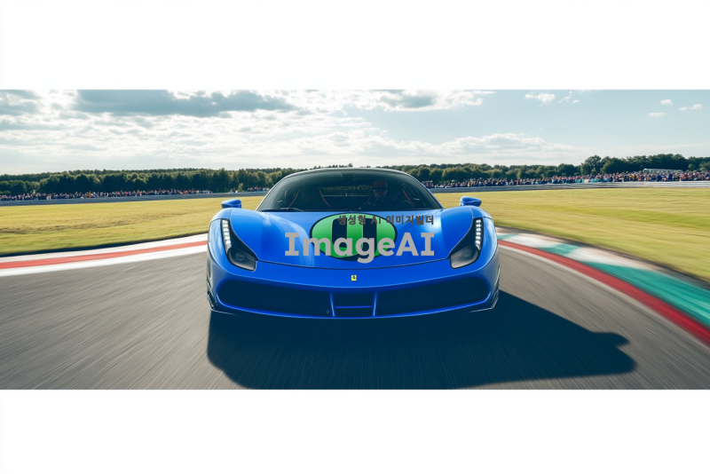 트랙 위를 달리는 현대적인 디자인의 고성능 스포츠카, 주변에는 푸른 하늘과 드넓은 초원이 펼쳐져 있으며, 차체의 윤곽이 빛을 받아 반짝이는 모습, 속도감과 역동성을 강조한 장면, 차체의 색상은 메탈릭 블루, 타이어가 땅을 강하게 움켜쥐고 있는 모습, 차량의 세부 디테일이 잘 드러나도록 가까이에서 촬영한 구도, 배경에는 관중들이 흥미롭게 지켜보는 모습.