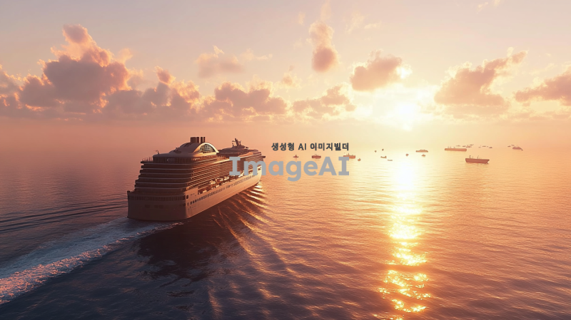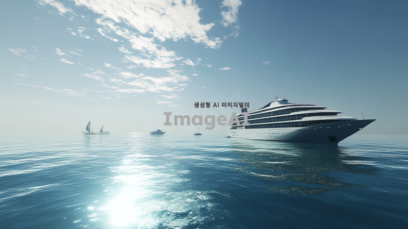 넓고 푸른 바다 위에 떠 있는 웅장한 크루즈선, 맑은 하늘과 부드러운 구름이 배경을 이루고 있으며, 햇빛이 반사되어 반짝이는 물결, 크루즈의 세부적인 외관과 갑판 위의 도시가 보이는 장면, 주변에 작은 보트와 해양 생물이 함께 어우러진 평화로운 분위기.