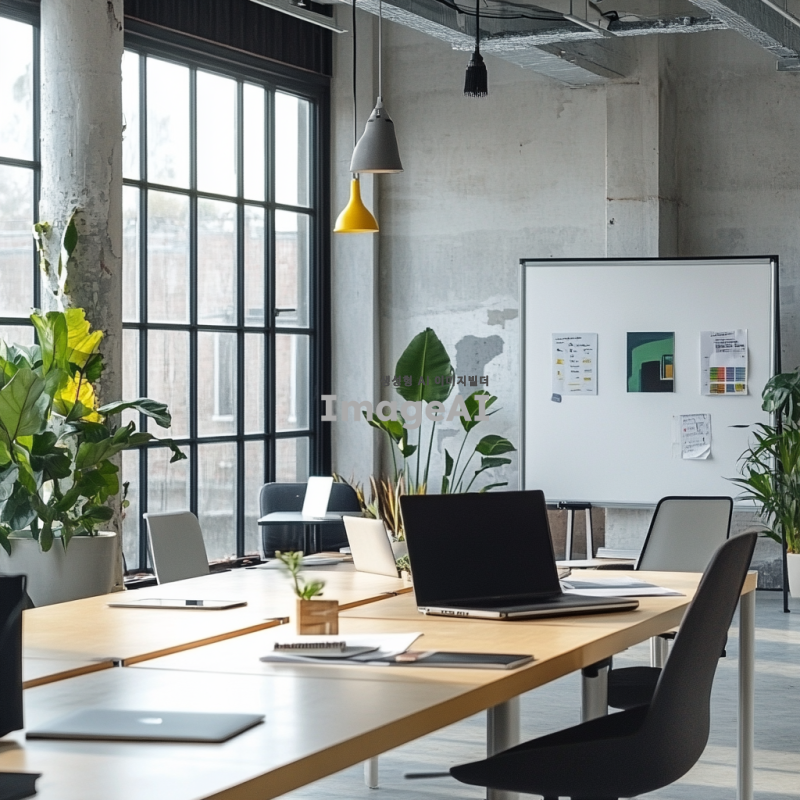 현대적인 오피스 공간, 넓은 창문으로 자연광이 들어오는 밝은 실내, 깔끔하고 세련된 가구 배치, 책상 위에는 노트북과 문서들이 정돈되어 있음, 벽에는 미니멀한 아트워크가 걸려 있고, 화분들이 곳곳에 배치되어 있어 녹색의 생기를 더함, 직원들이 협업하는 모습, 회의실에는 화이트보드와 빔프로젝터가 준비되어 있음, 전체적으로 차분하고 전문적인 분위기.