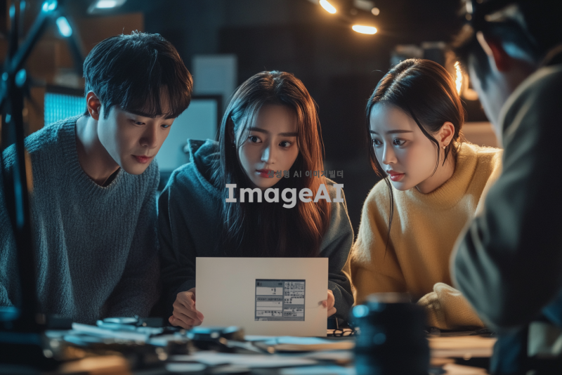 한국인 출연진들이 모여 있는 스튜디오, 테이블 위에 놓인 미션 카드가 담긴 봉투, 출연진들이 호기심 어린 표정으로 봉투를 바라보는 장면, 밝고 활기찬 분위기, 스튜디오 배경은 현대적이고 세련된 디자인, 조명이 부드럽게 비추며 따뜻한 느낌을 주는 장면.