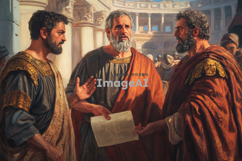 고대 로마 시대의 도시 배경, 세 명의 인물이 중심에 있음. 왼쪽에는 서기오 바울, 중간에는 사도바울, 오른쪽에는 마술사 엘루마. 서기오 바울은 진지하게 사도바울을 바라보고 있으며, 사도바울은 강한 의지를 가진 표정으로 엘루마를 책망하는 모습. 엘루마는 당황한 표정으로 손을 들어 막으려는 자세. 사도바울은 손에 두루마리를 들고 있으며, 엘루마와 서기오 바울 사이의 긴장감이 느껴짐. 고대 로마의 의상을 입고 있으며, 배경에는 로마식 건축물이 보임. 빛이 사도바울에게 비추어 그의 존재감을 강조.