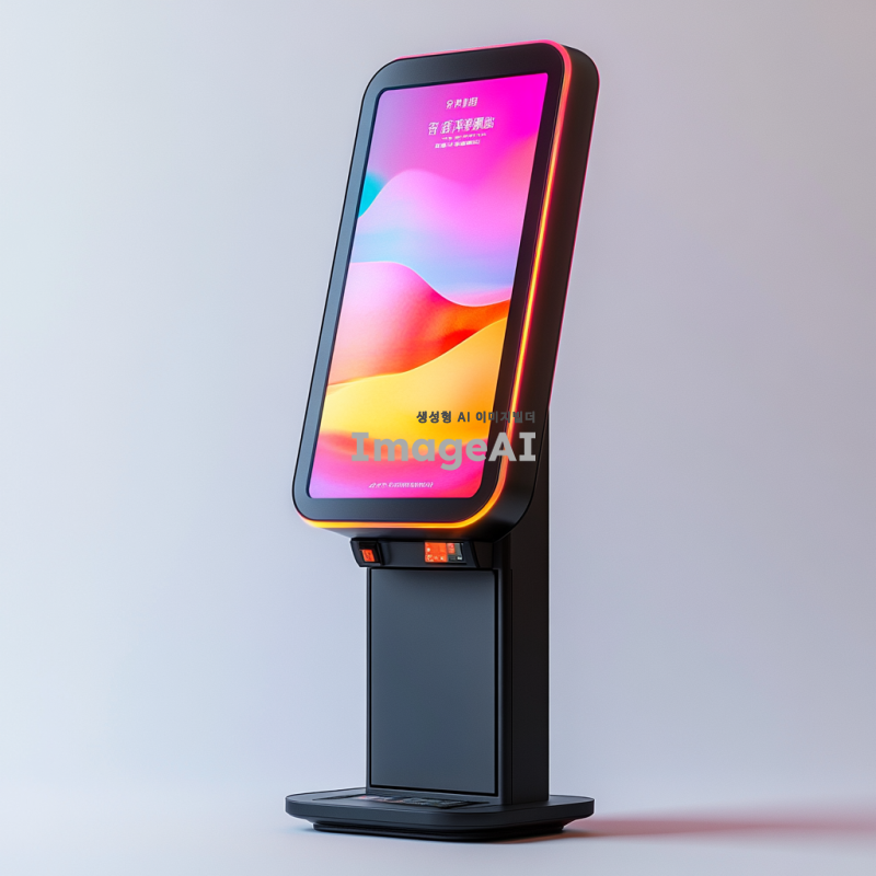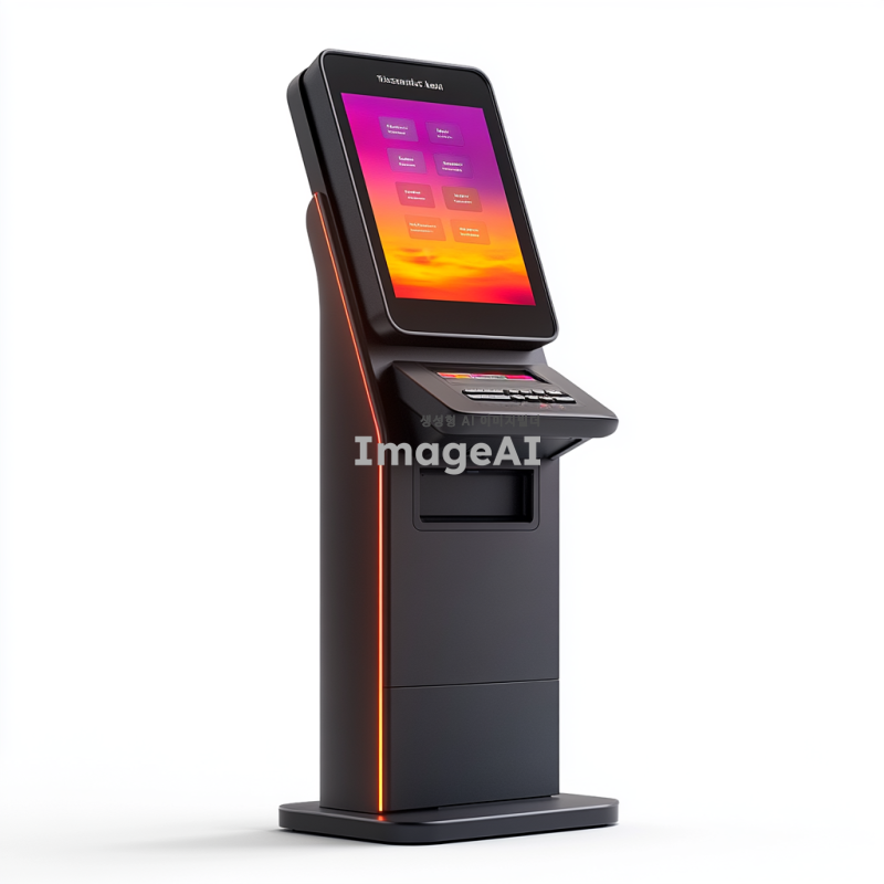 세련되고 현대적인 디지털 키오스크로 타로카드가 출력된 LED 디스플레이가 있습니다. 전면에는 카드 및 현금 등록기가 있습니다. 검은색 베이스가 높이 서 있으며, 어떤 각도에서도 보입니다. 상단에는 광고 텍스트나 브랜딩을 위한 공간이 있습니다. 하얀 배경에 고립되어 있습니다.