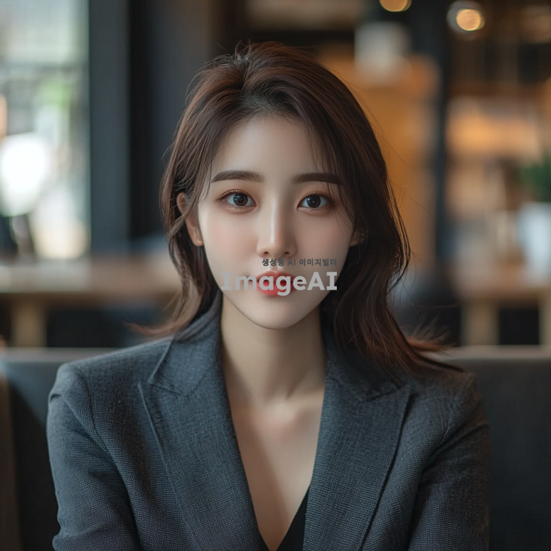 20대의 한국인 여성, 여성미가 강조된 모습, 세련된 직업복을 입고 있으며 과한 노출은 피하면서도 매력적인 포즈를 취하고 있는 모습. 하얀 피부와 건강한 머릿결을 가진, 자신감 넘치는 표정으로 카메라를 바라보고 있는 장면. 배경은 도시적인 느낌의 세련된 카페나 사무실로 설정.