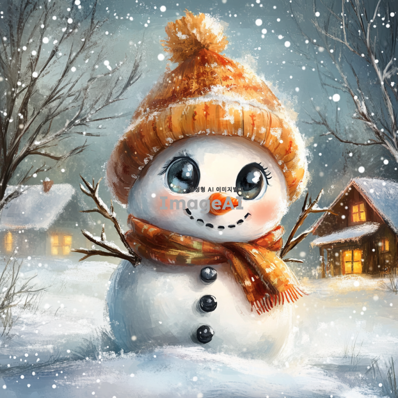 눈사람 캐릭터를 디자인해줘. 귀여운 표정과 함께 눈사람의 몸은 두 개의 큰 눈으로 구성되어 있고, 모자는 따뜻한 털모자와 목도리를 하고 있어. 눈사람의 손은 나뭇가지로 만들어졌고, 주변에는 눈이 쌓인 겨울 풍경이 펼쳐져 있어. 배경에는 눈 내리는 하늘과 함께 작은 집이 보인다. 전체적으로 아기자기하고 따뜻한 느낌을 주는 이미지로 만들어줘.