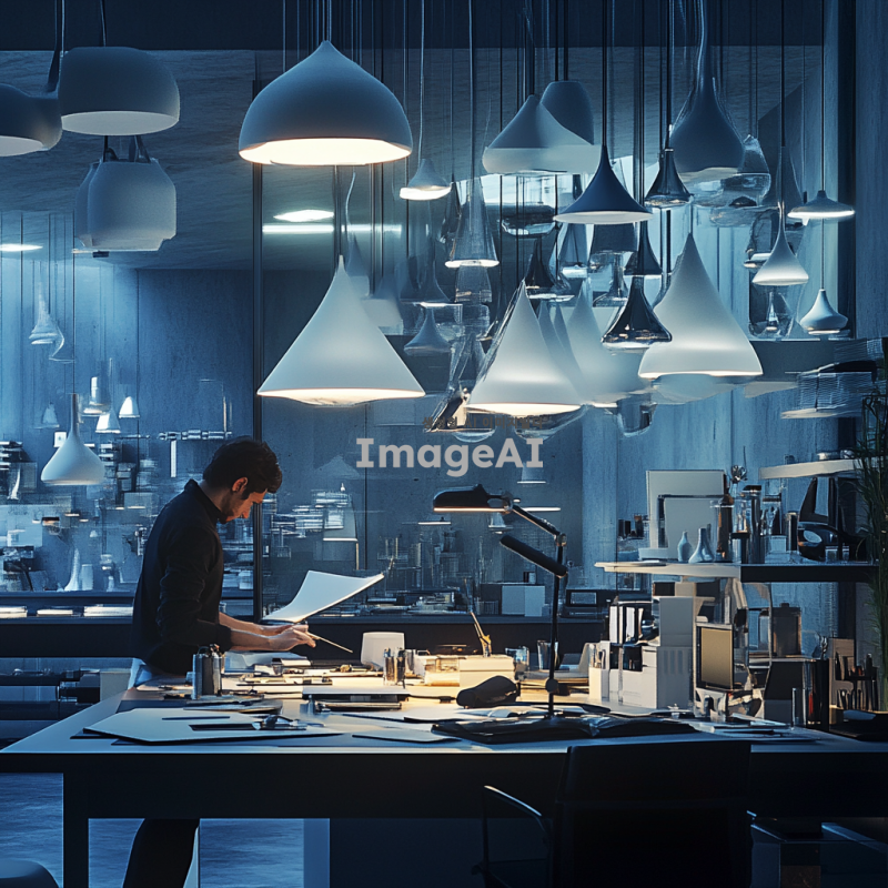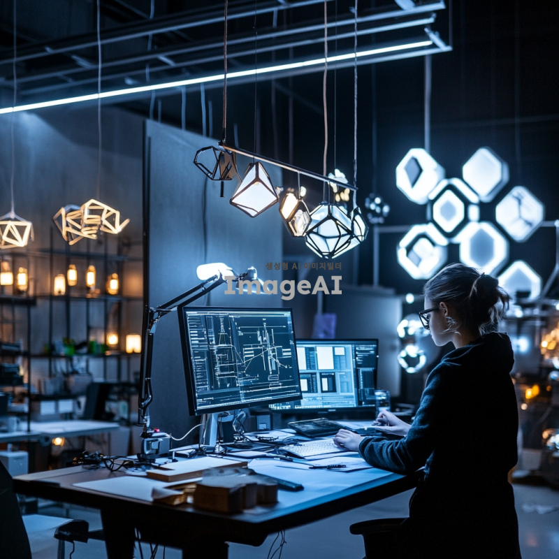 다양한 조명기구가 있는 미래적인 작업장에서 조명 디자인을 하고 있는 사람의 모습