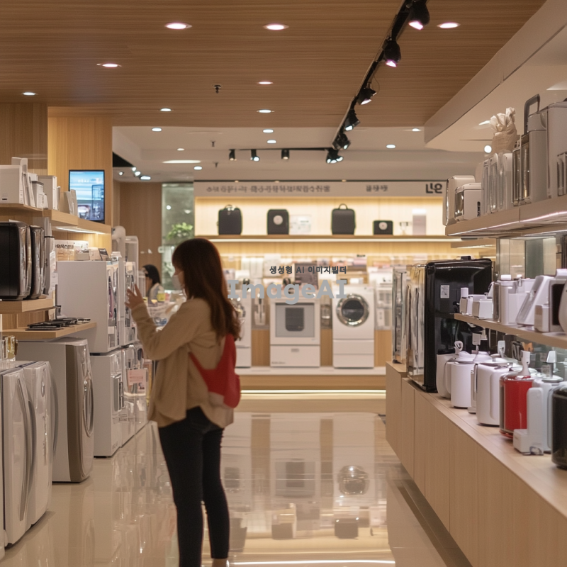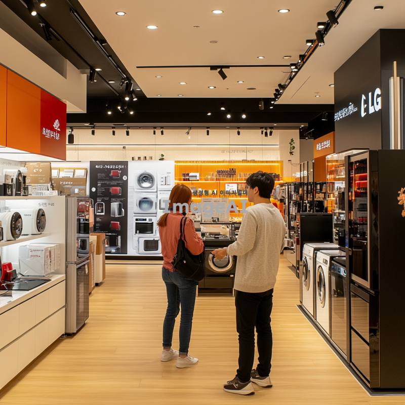 LG 베스트샵의 한정 할인 행사 홍보를 위한 이미지, 한국인 고객이 전자제품을 살펴보는 모습, 다양한 LG 가전 제품이 진열된 매장 내부, 화사한 조명 아래 즐거운 분위기, 할인 가격 태그가 붙어 있는 제품들, 인스타그램에 적합한 세련된 디자인, 현대적인 느낌, 매력적인 색상 조합, 고객이 제품에 관심을 가지는 모습.