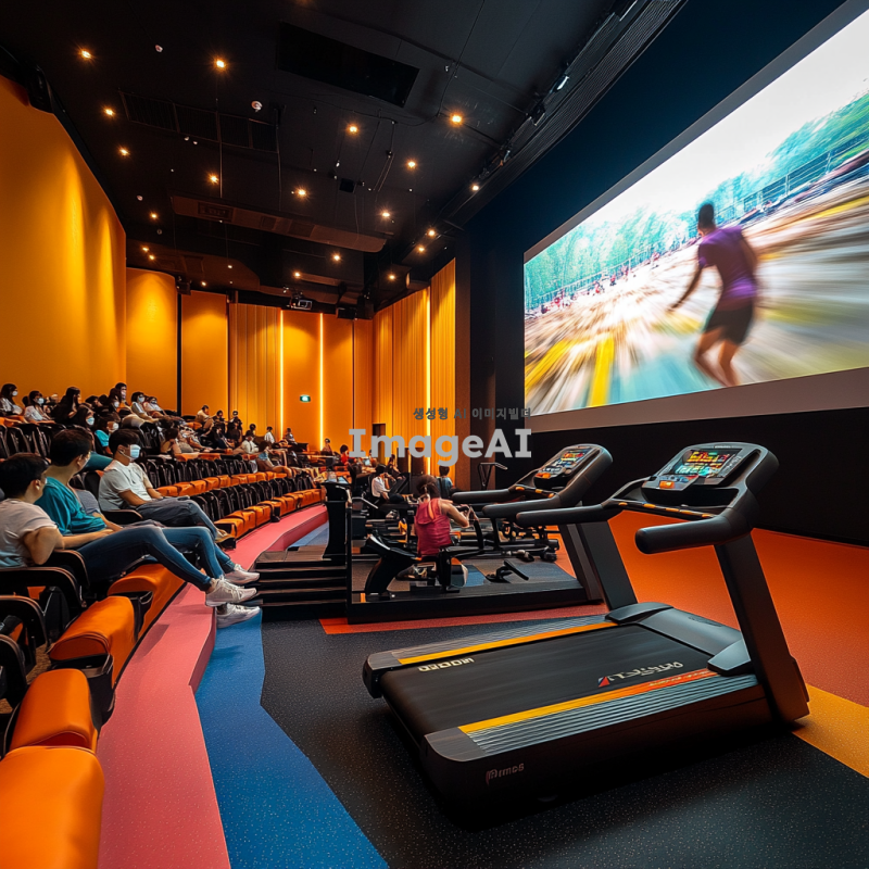 극장 내부, 오른쪽에 위치한 런닝머신, 현대적인 디자인, 조명이 밝고 화려한 극장 분위기, 관객들이 영화를 감상하는 모습, 런닝머신 위에서 운동하는 한국인 남성, 실내 운동과 영화 관람이 조화를 이루는 장면, 생동감 넘치는 색감.