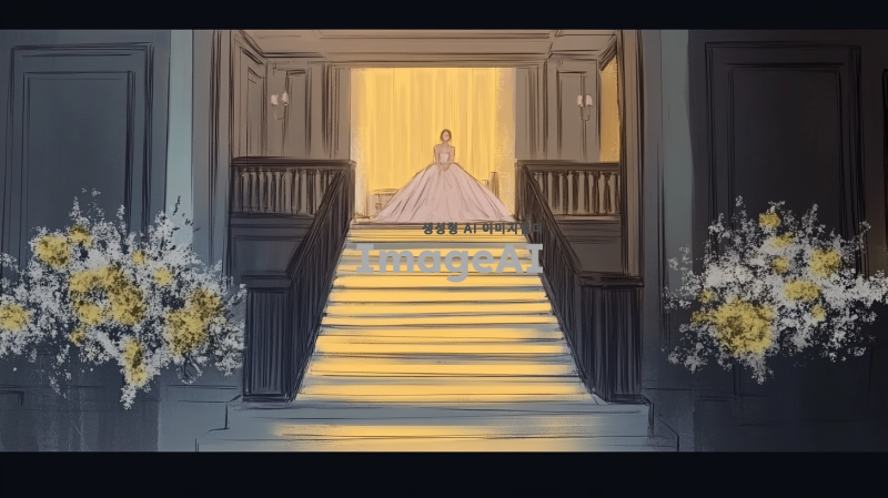 링크호텔의 신부대기실을 그려줘 양쪽벽을 막고 아래 계단을 2개 만들어줘 계단 간접조명은 노란빛이야