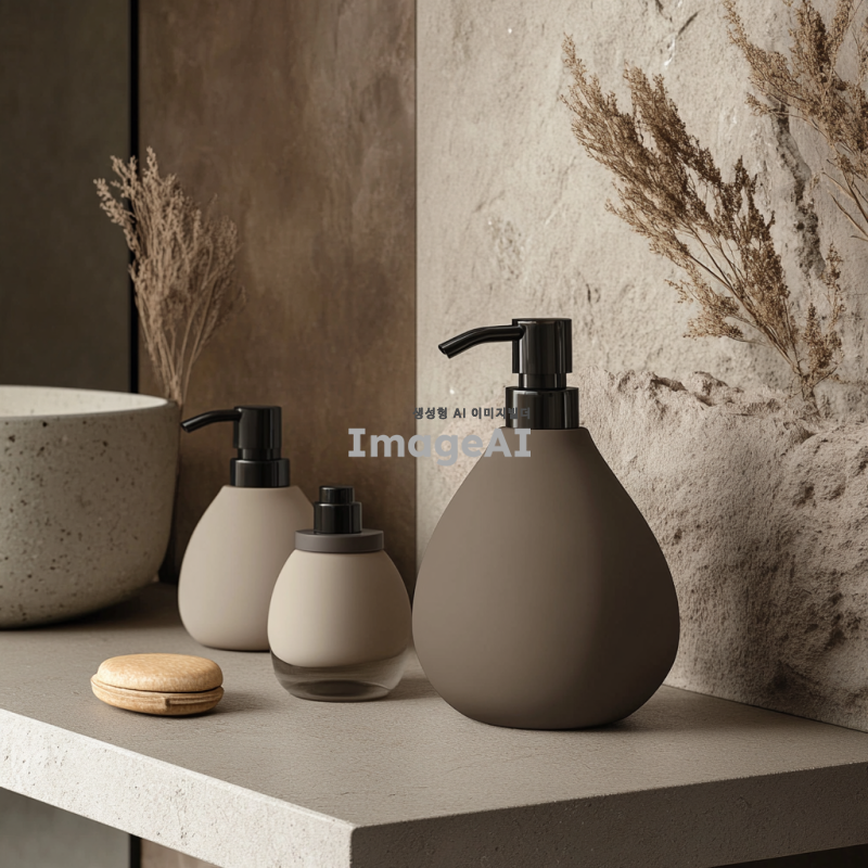 바위를 모티브로 한 샴푸 용기 디자인, 매스감이 느껴지는 형태, 표면은 모카크림 색상, 세미매트 광택 처리, 자연적인 요소와 조화를 이루는 디자인, 현대적이고 세련된 느낌 강조.