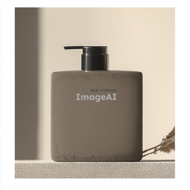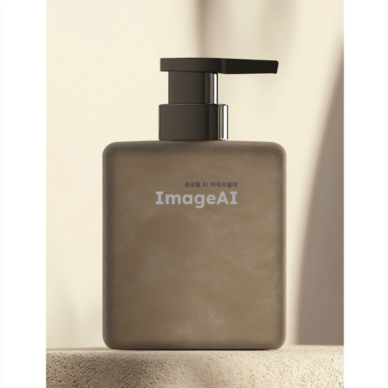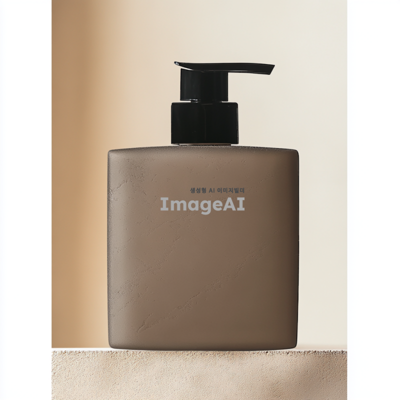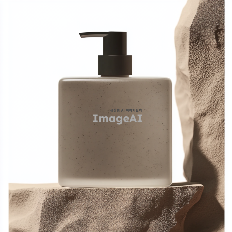 옆으로 넓은 직육면체 형태의 바위를 모티프로 한 샴푸 용기 디자인, 색상은 모카크림색, 표면은 세미매트 광택을 가진, 자연 친화적인 느낌을 주는 디자인.